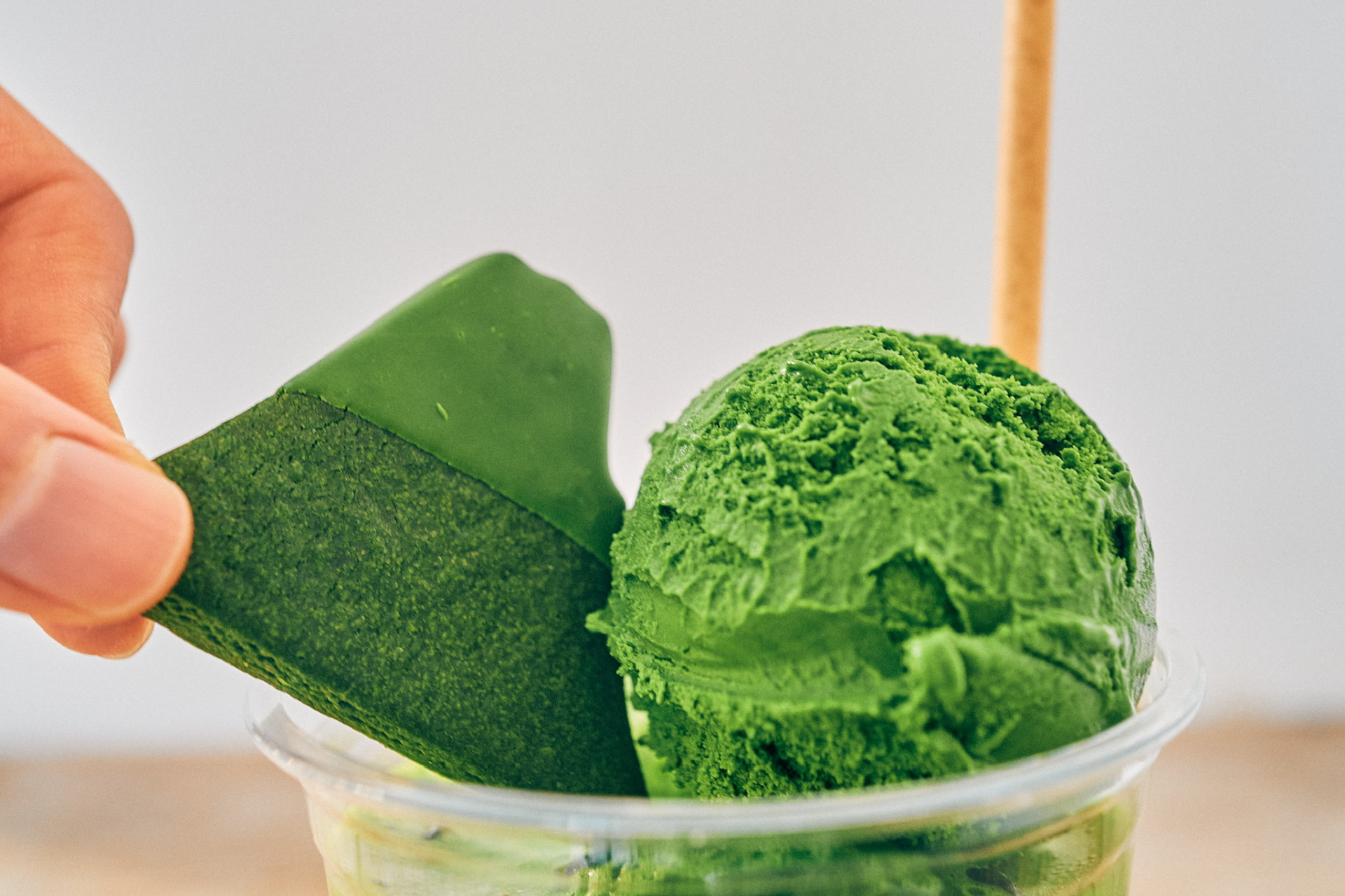 「富士抹茶クッキー」はドリンクにもトッピング可能です。アイスクリームにディップしてお召しがりください。