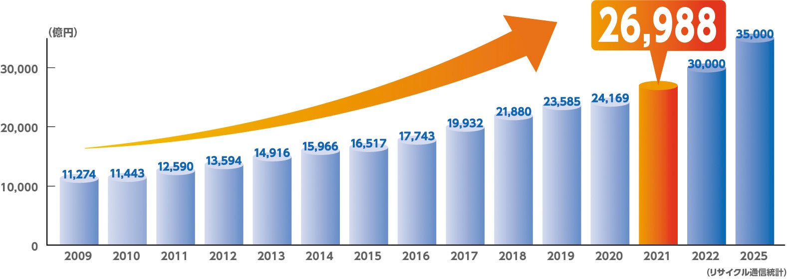 リユース市場は経済状況の大きな変化を転機に拡大しており、近年では前述の通り、SDGsの流れもあり2021年の市場規模は2兆6988億円(前年比11.7%増)で、12年連続で成長しています。そのうち、カテゴリー別で「日用品・生活雑貨」は754億円の市場があり、前年比9.8%と伸長していることから、今後も拡大すると予測されます。※出展:リサイクル通信「リユース業界の市場規模推計2022(2021年版)」より