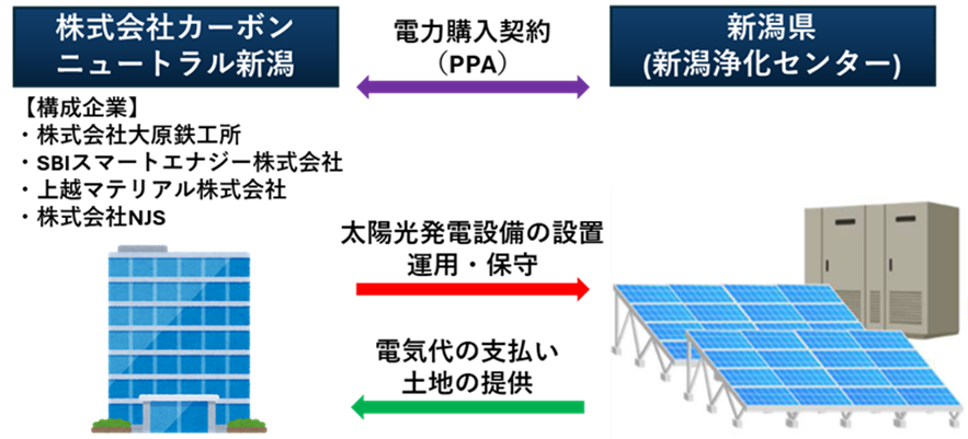 当社は、株式会社大原鉄工所、SBIスマートエナジー株式会社、上越マテリアル株式会社とともに2025年11月11日に新潟県と「新潟浄化センター太陽光発電設備導入事業」に関する契約を締結し、実施事業者に決定しました。また、契約締結に伴い、同4社は、2025年12月25日付けにて特別目的会社「株式会社カーボンニュートラル新潟」(以下、同SPC)を設立いたしました。