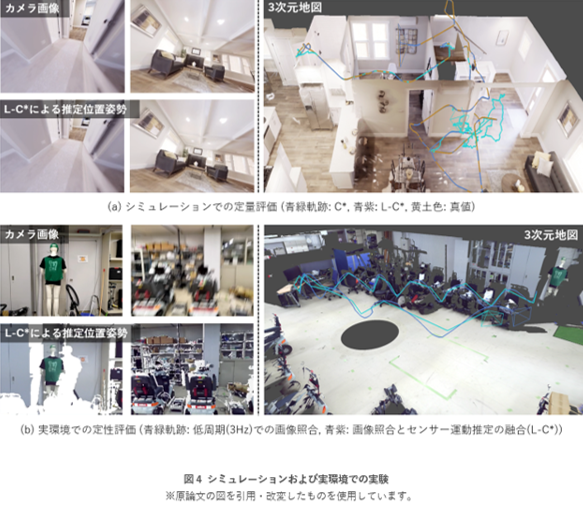 L-C*の性能を調べるため、シミュレーションを利用した定量評価を行いました(図4(a))。具体的には、シミュレーター上の3次元地図中に設定した軌道に沿ってカメラ画像列・IMU値の合成データを生成し、L-C*により元の軌道を正確に逆算できるか、推定精度と完遂率の2つの指標で評価しました。また、位置推定の周期を30 Hzから1 Hzへ低下させる、地図とカメラ画像間の見えを変化させるなど、実験条件の違いへの頑健性も試験しました。実験結果では、いずれの条件・環境においても位置姿勢を推定でき、推定精度の誤差は最小3 mm、悪条件においても最大140 mmにとどまりました。旧来のC*では急旋回や見えの変化により推定が途中で失敗しており、今回の実験ではセンサーフュージョンの有効性が明らかになっています。また、スマートフォン搭載のセンサーを利用して実環境でも評価を行いました(図4(b))。シミュレーションと同様、L-C*は激しい動きや回転運動にも安定して追従できるため、実用的な成果が得られています。