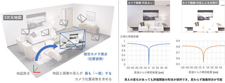 システムの中核であるカメラ位置姿勢推定には、L-C*の前身であるC*と同様の技術を利用しました。3次元地図とカメラの画像が「一致」する視点を探す(図2(左))のが位置姿勢推定の基本的な処理です。この「一致」には多様な定義があります。例えば、「色差」が小さくなることを一致と定義すれば、カメラ画像と色の配置が類似した視点が探し出せます。しかし、地図作成時から時間が経過し物の配置や天候の変化が起きると、地図とカメラ画像とで景色が大きく変わってしまい、色が変わらないことを前提としている指標では推定が困難になります。これに対し、C*では正規化情報距離を用い、「色の共起性」を一致の指標として地図とカメラ画像を照合します。これは、色の差を細かに評価する先の例とは対照的に、画像の明るい領域では地図も明るい傾向がある、というような同時性に基づき類似度を測るものです。例えば、図2(右)に示す白飛びのような外乱が起きた場合、色を直接比較する指標では類似度が正常に評価できなくなります。一方、正規化情報距離を用いるC*では、図2(右下)にあるように類似度を測る関数の形状が変わらず保持できており、画像と地図を安定的に照合できます。しかし、C*は照合に多量の計算が必要で、また照合のわずかな失敗で推定が継続できなくなるなどの課題がありました。