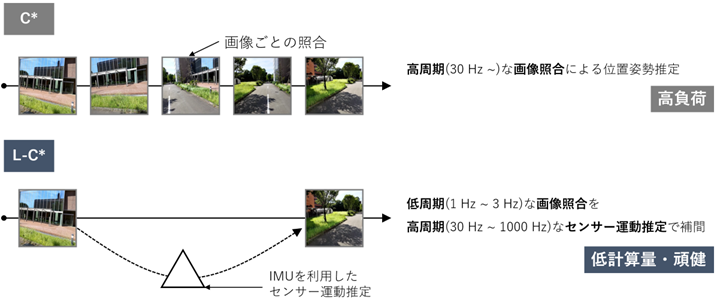 今回の成果は、このC*をセンサーフュージョンの枠組みで拡張し、照合の安定化、計算量の大幅な低減を可能にしたものです。具体的には、カメラとIMUを利用した計算負荷の低いVisual-Inertial Odometry(VIO)によりセンサーの細かな動きを求め、画像照合間の運動を補う仕組みを導入しました(図3)。これにより、1 Hz程度の低頻度な画像照合であっても安定してVPSを維持可能なフレームワークを構築し、一時的な照合の失敗にも頑健なシステムを実現しました。計算量の多い画像照合を30 Hz程度で処理する必要があったC*と比較すると、L-C*の演算負荷は1/30まで低減されており、小型の組み込みPCでも利用可能になりました。