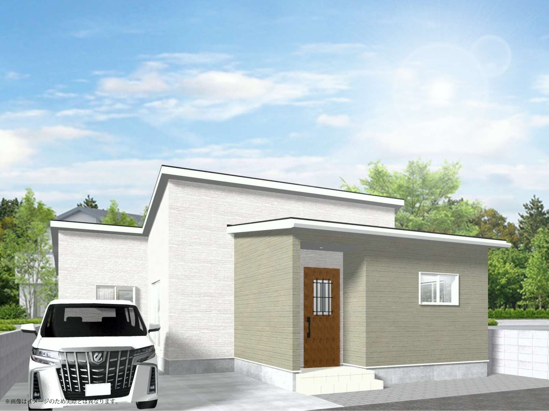 ホワイト×グリーン×ウッド調でナチュラルな外観。勾配天井とシーリングファンを組み合わせたリビングは、開放感抜群。玄関、キッチン、各居室に充実の収納スペースがあり、自然と部屋が片付く間取りです。