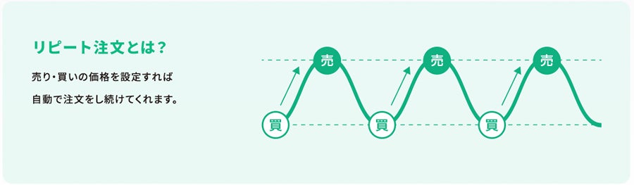 自動売買機能とは、一定のルールに基づいて24時間売買を繰り返すシステムのことです。当社が提供開始する自動売買機能は、100円から取引できるため、自動売買機能を活用したことがない方でも手軽に始めやすいことが大きな特徴です。自動取引の手法としては、注文内容をあらかじめ設定し自動で取引を行うリピート系注文で、レートの上限・下限や売買の値幅など、シンプルな設定でお取引を開始することができます。一定値幅で価格が上下を繰り返すようなレンジ相場でも、自動的に繰り返し利益を積み上げていくことが期待できます。