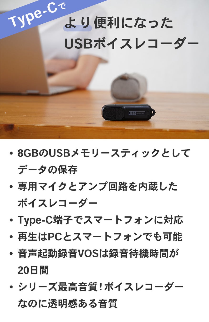 また、今回のボイスレコーダーには当社企画初のUSB端子をTYPE-Cで製作し、PCだけでなくスマホでの録音再生に対応しました。
