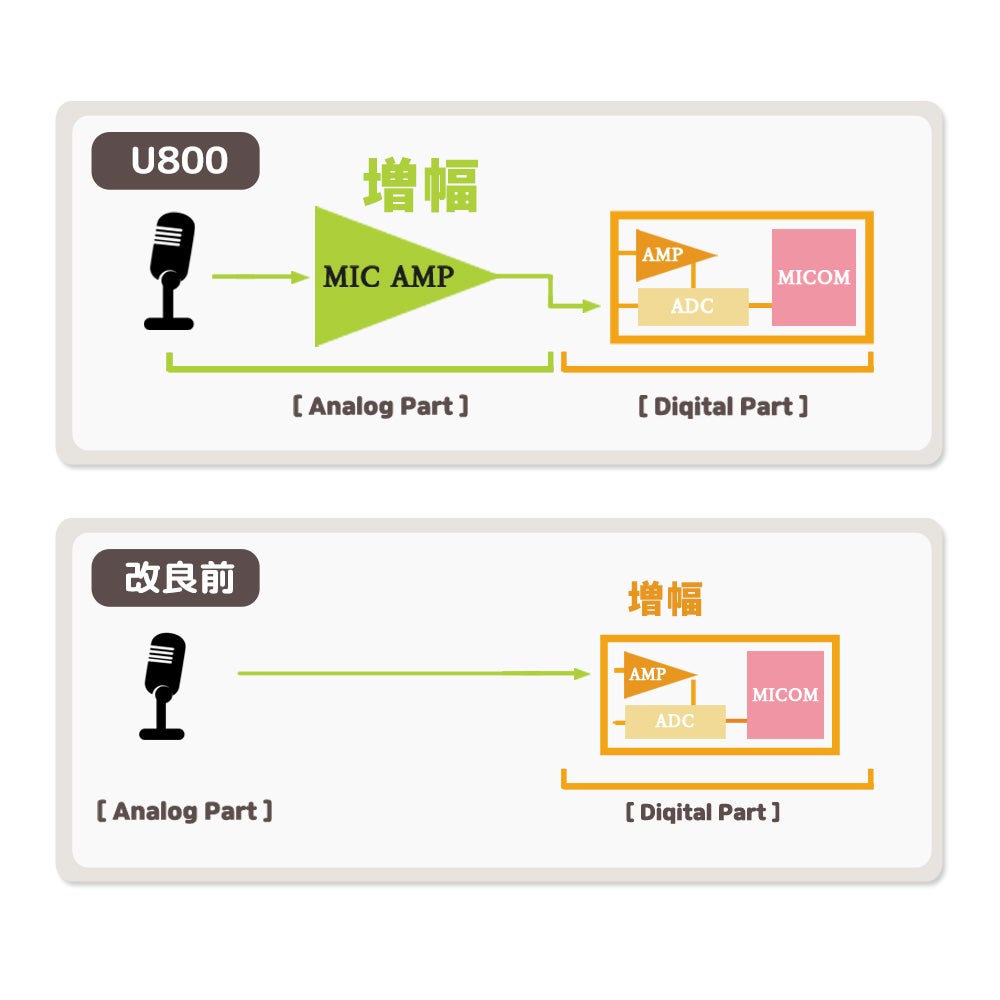 アナログ信号信号であるマイク信号はいたずらに増幅するとノイズも拡大してしまいます。