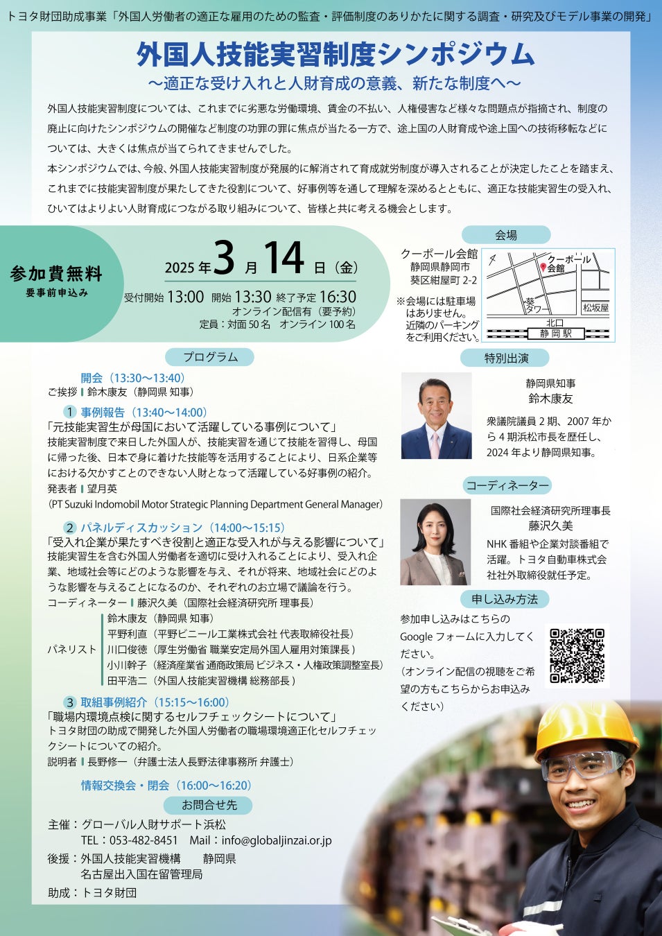 一般社団法人グローバル人財サポート浜松(静岡県、代表理事 堀 永乃)は、適正な外国人労働者の受け入れと人財育成が果たす意義について、みなさまと考えるシンポジウムを開催します。