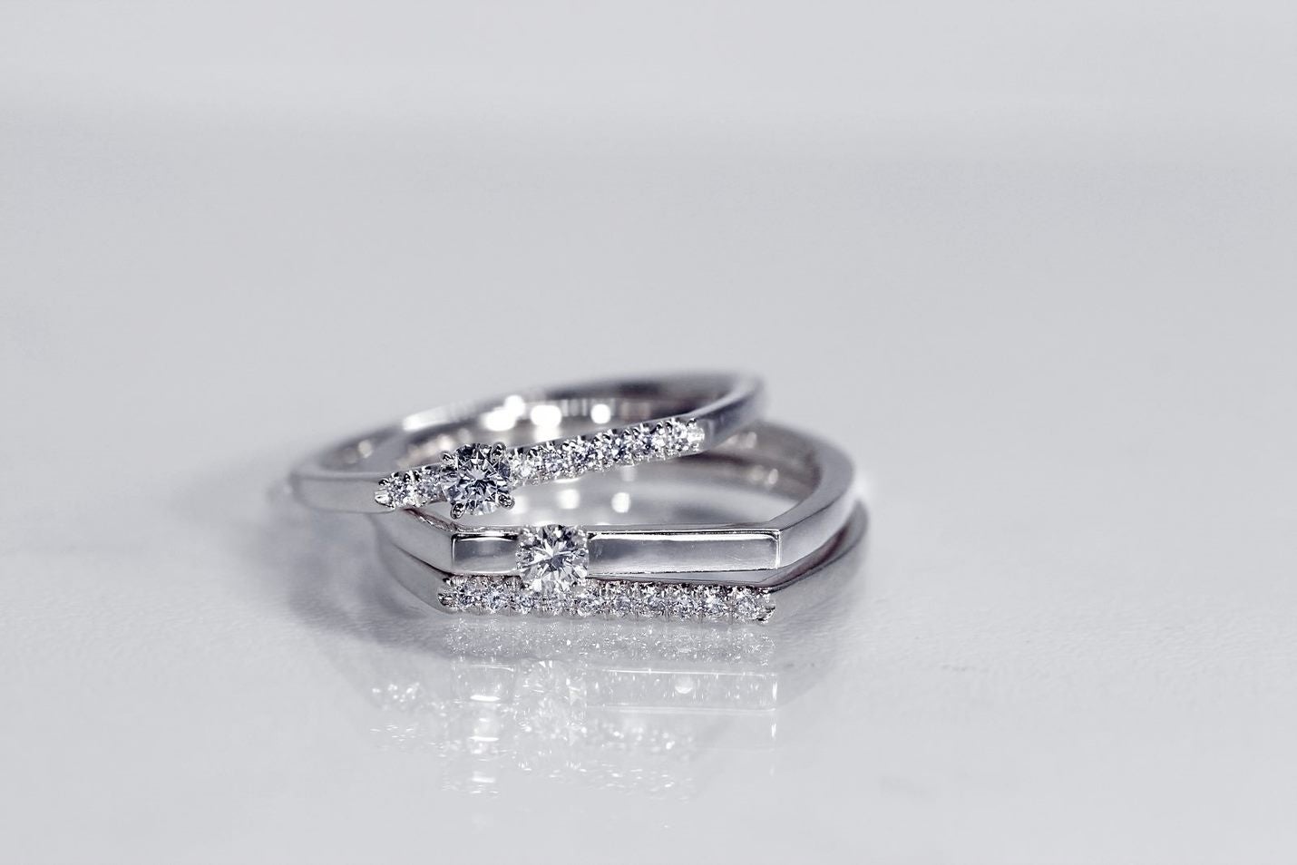 ホワイト系のSIクラスの天然ダイヤモンドを使用。 1個でも重ねて着けても。アシンメトリーな個性のデザインリング。