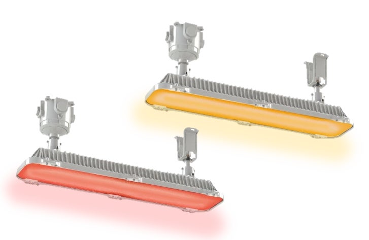 本製品は、1台に「白色LED」と「有色LED(赤色またはアンバー色)」の2色のLEDを搭載し、通常時は⽩⾊LEDで常用照明として使用し、異常を検知した場合や危険信号があった場合、白色と有色が交互点滅するアラート灯に切り替わる防湿・密閉形照明器具です。