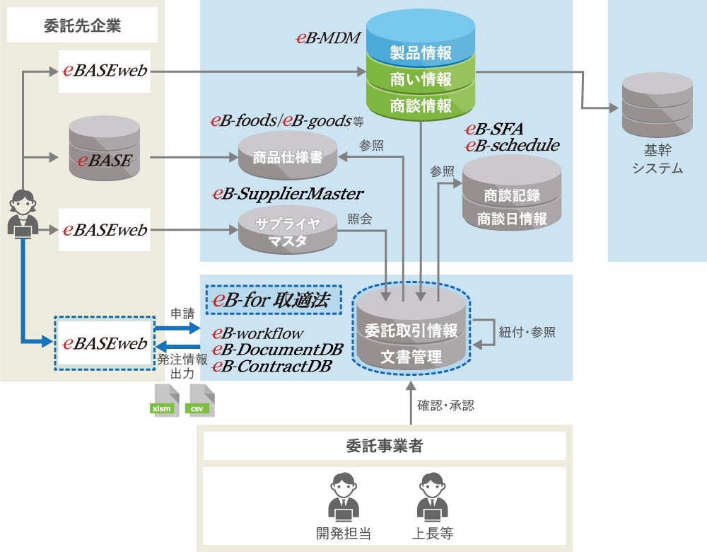 eBASE商品マスタ(eB-MDM)や商品仕様書管理システム(eB-foods / eB-goods / eB-OTC 等)との連携運用も可能になります。