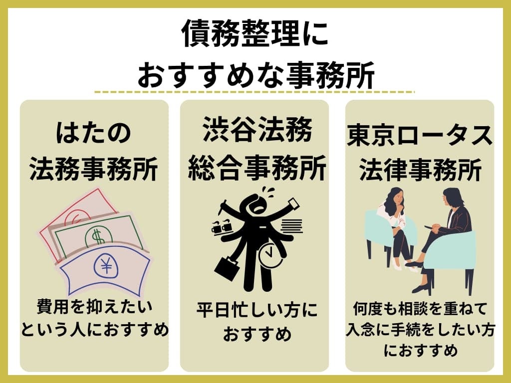 債務整理におすすめな事務所は「はたの法務事務所」「渋谷法務総合事務所」「東京ロータス法務事務所」の3つです。