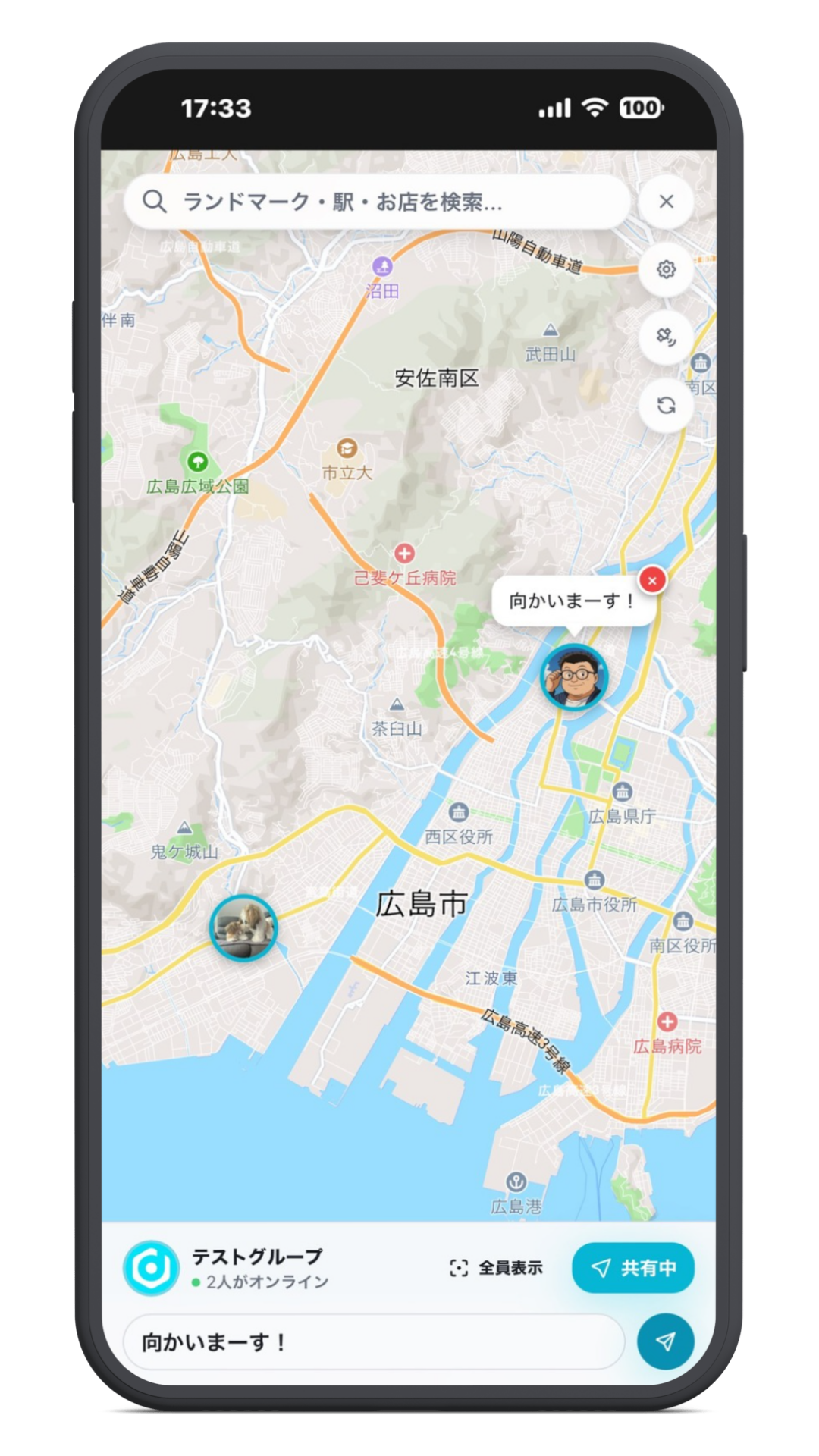 家族や友達とグループを作成し、現在地をリアルタイムで共有できます。