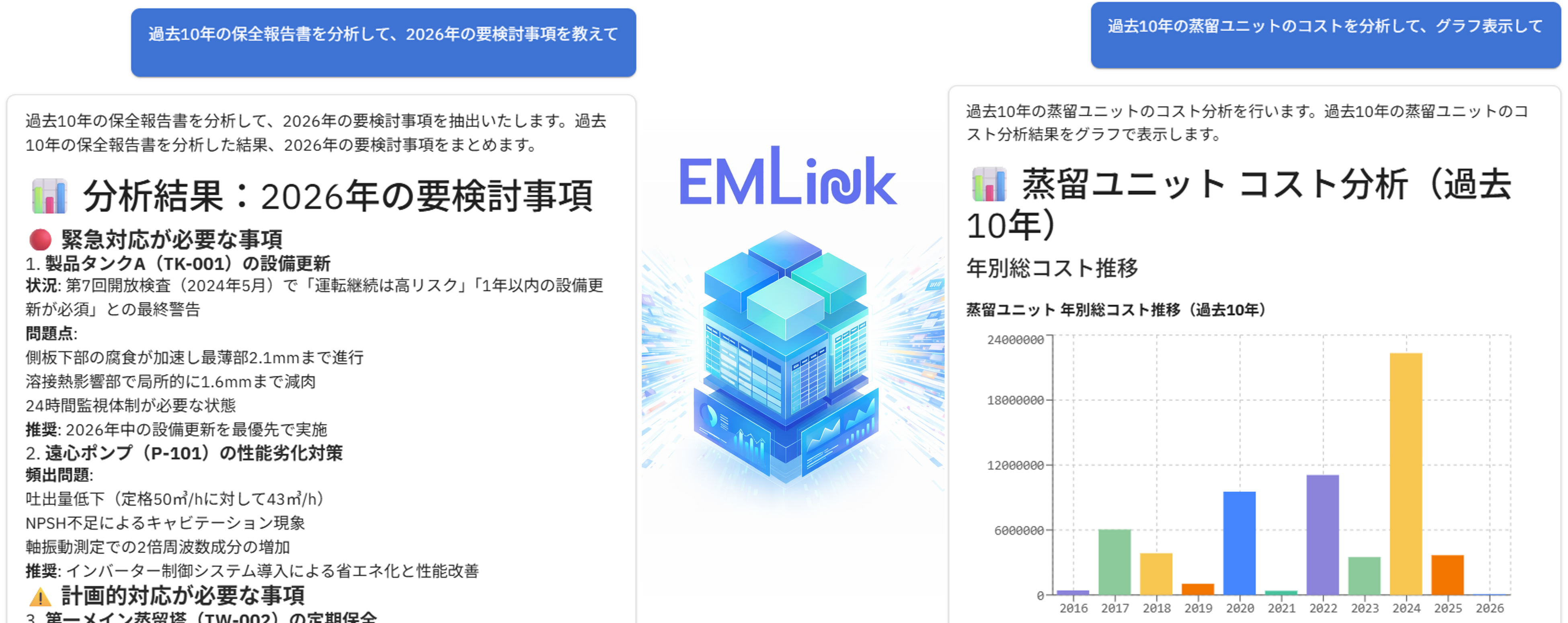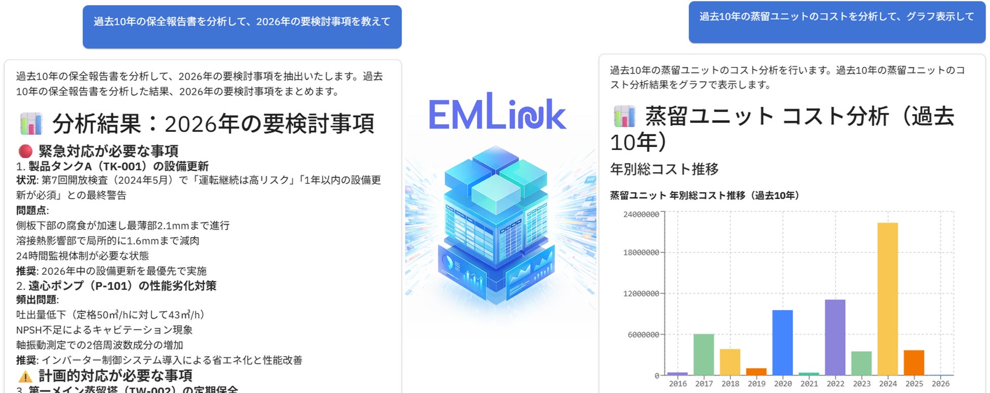 株式会社設備保全総合研究所(本社:東京都目黒区、代表取締役CEO:相原章吾)は、AIネイティブ設備保全クラウド『EMLink』において、AIエージェント機能EMLink Intelligenceを大幅アップデートしました。本機能は、膨大な保全データを分析し、リスク評価から保全計画の立案まで、経営者および保全担当者の「頼れる相棒」として業務を支援します。
