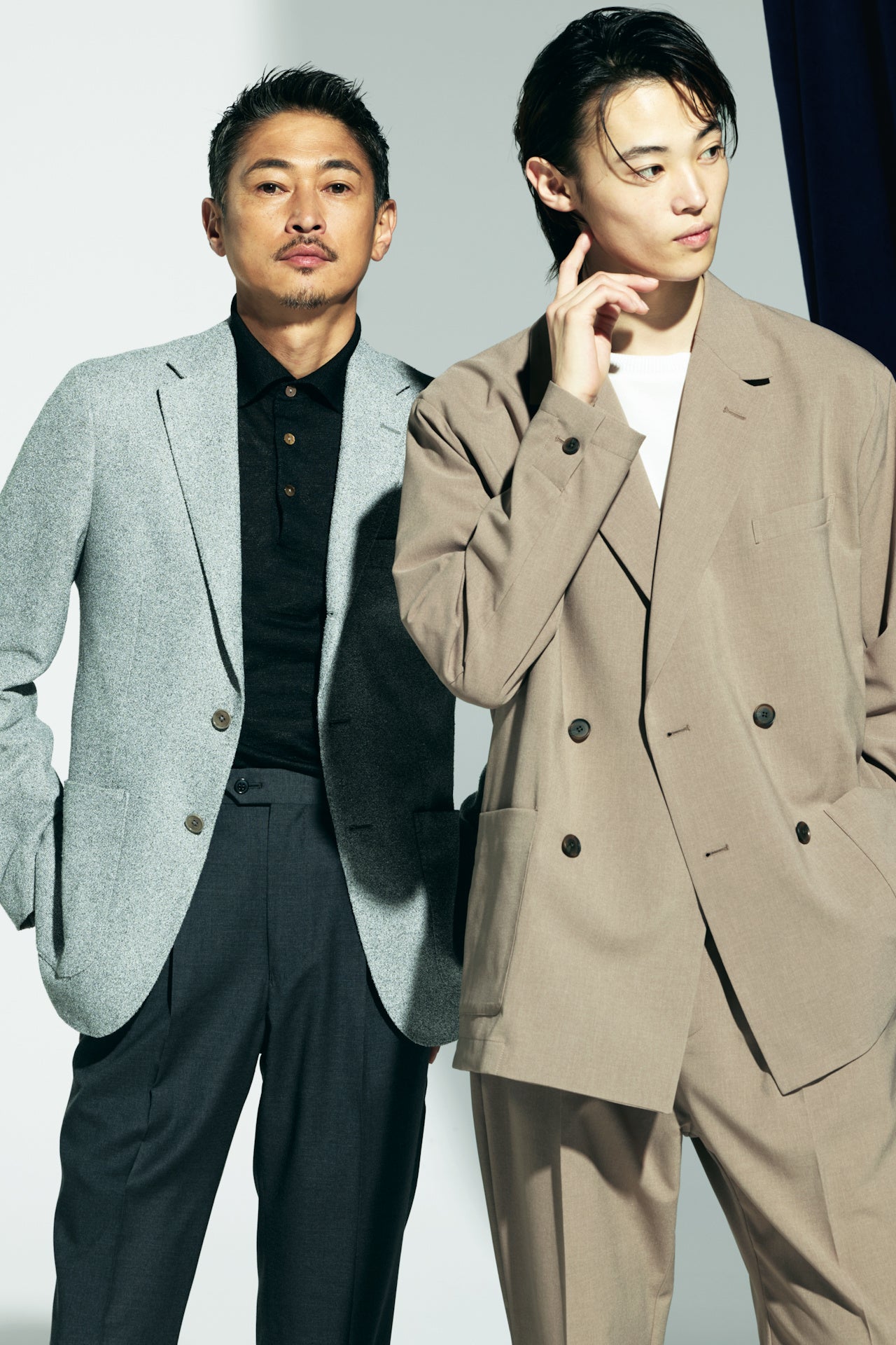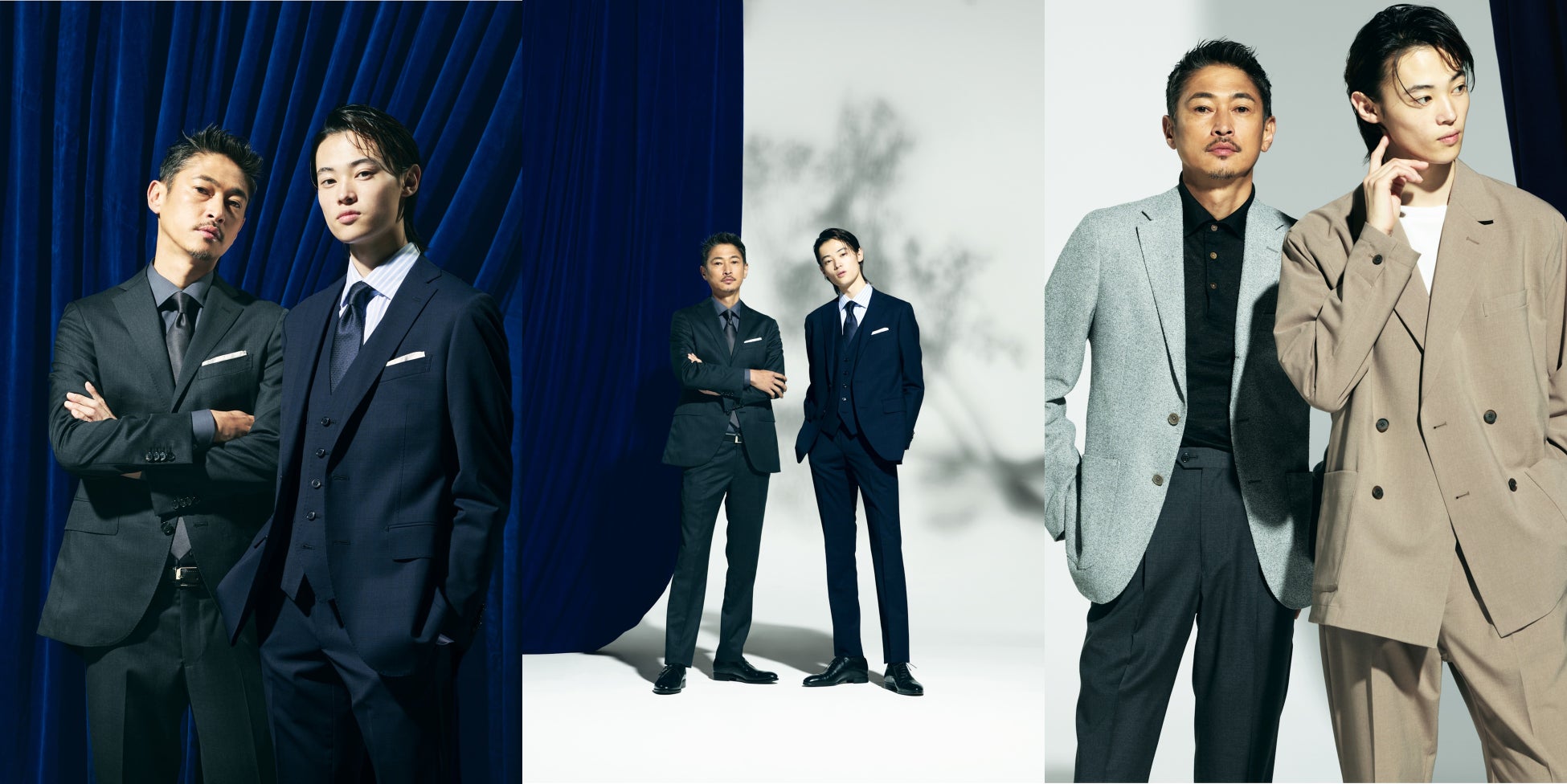 お二人に出演いただいた今回のクリエイティブは、「生まれ変わる」をメインのテーマに、今回は「新たなスタートを切る」というメッセージを伝えていきます。テーマである「生まれ変わる」を表現するため上半身裸での撮影や、窪塚親子が魅せるスーツスタイル、オフィスカジュアルの着回しを訴求しています。撮影現場では、洋介さんが愛流さんに仲良く寄り掛かったり、愛流さんの顔を隠すポーズを取るなど、遊び心を交えながら現場を盛り上げてくださっているのが印象的でした。