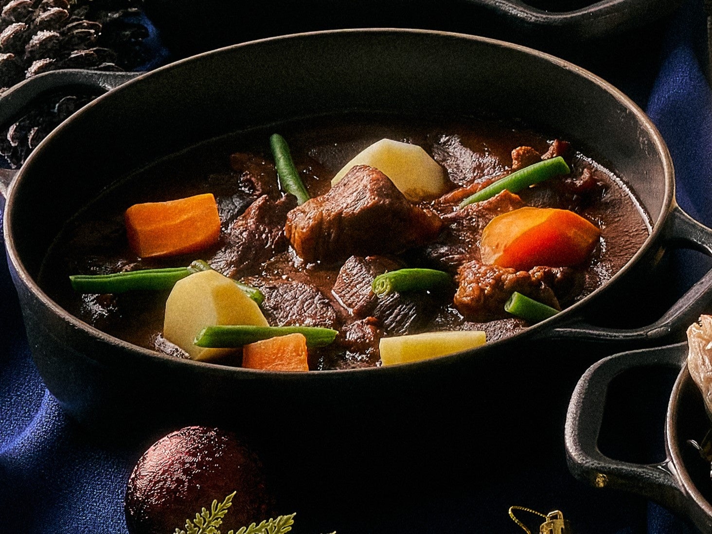 赤ワインをたっぷり使い、じっくりと3時間煮込んだ牛肉の煮込み料理。