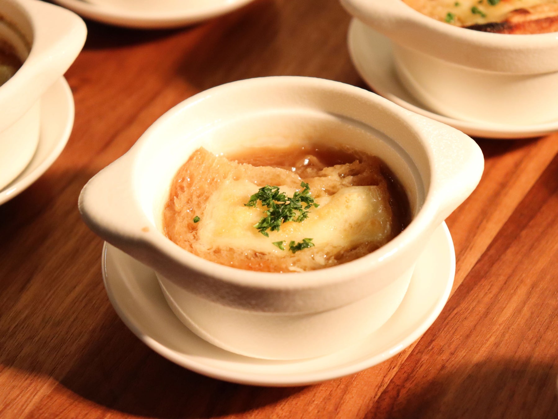 玉ねぎをじっくりとあめ色になるまで炒め、玉ねぎの旨味を凝縮したスープは心も体も満たされる一杯です。