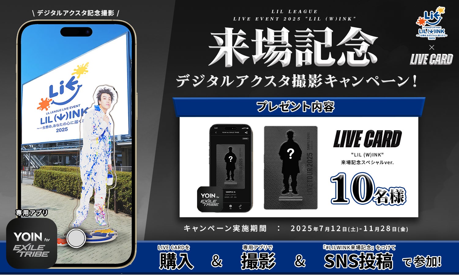 株式会社Digittle(本社:東京都渋⾕区、代表取締役:韮澤 真⼈、以下当社)は、株式会社LDH JAPAN(本社:東京都目黒区、代表取締役社長:五十嵐広行 以下、LDH)の所属アーティスト LIL LEAGUE が7月11日から開催するツアー「LIL LEAGUE LIVE EVENT 2025 "LIL (W)INK" ~一生懸命、あなたの心に届くまで~」にて、ライブイベント参加記念のデジタルグッズ「LIVE CARD」を販売します。