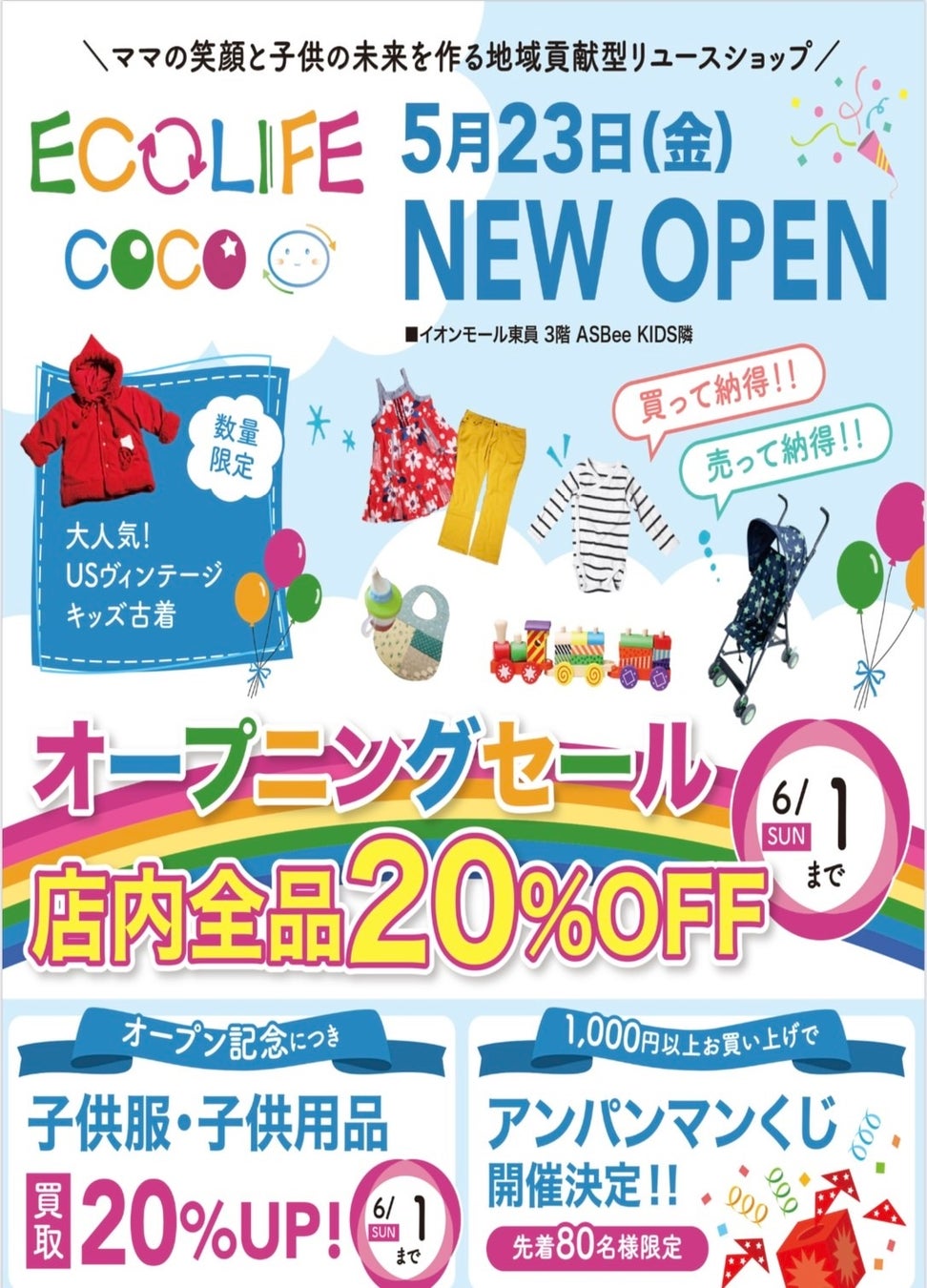 子供服リユースショップECOLIFE COCO(エコライフココ)「イオンモール東員店」を2025年5月23日(金)にオープンすることが決定いたしました。オープニング記念として店内全商品20%OFF、買取査定額の20%UPを実施いたします。また新品の児童書を定価の40~70%オフでご提供するほか、アウトレット品の販売も予定しております。お子様もママもおトクがいっぱいですのでぜひ御来店ください。