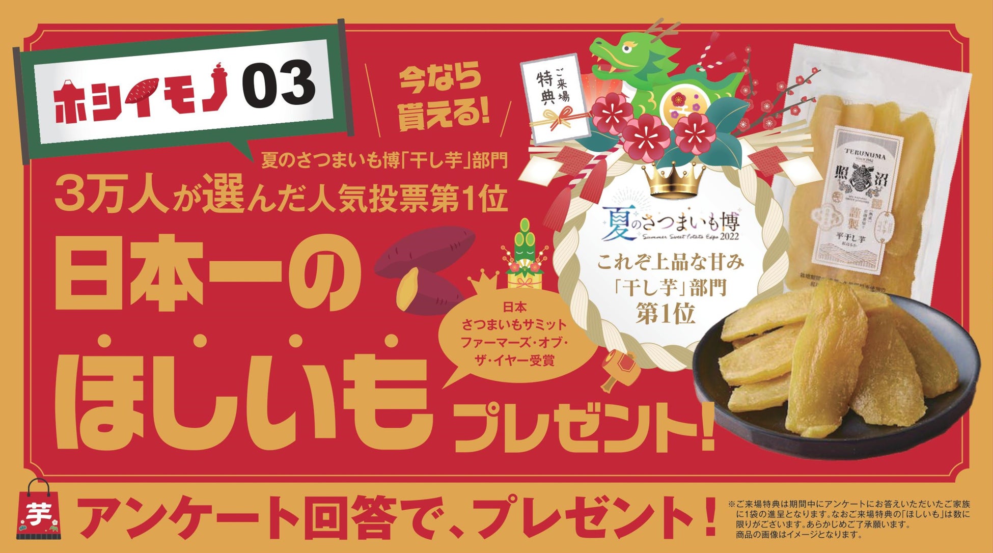 期間中に店舗へご来場いただきアンケート回答でもれなく『日本一の干し芋』プレゼント!