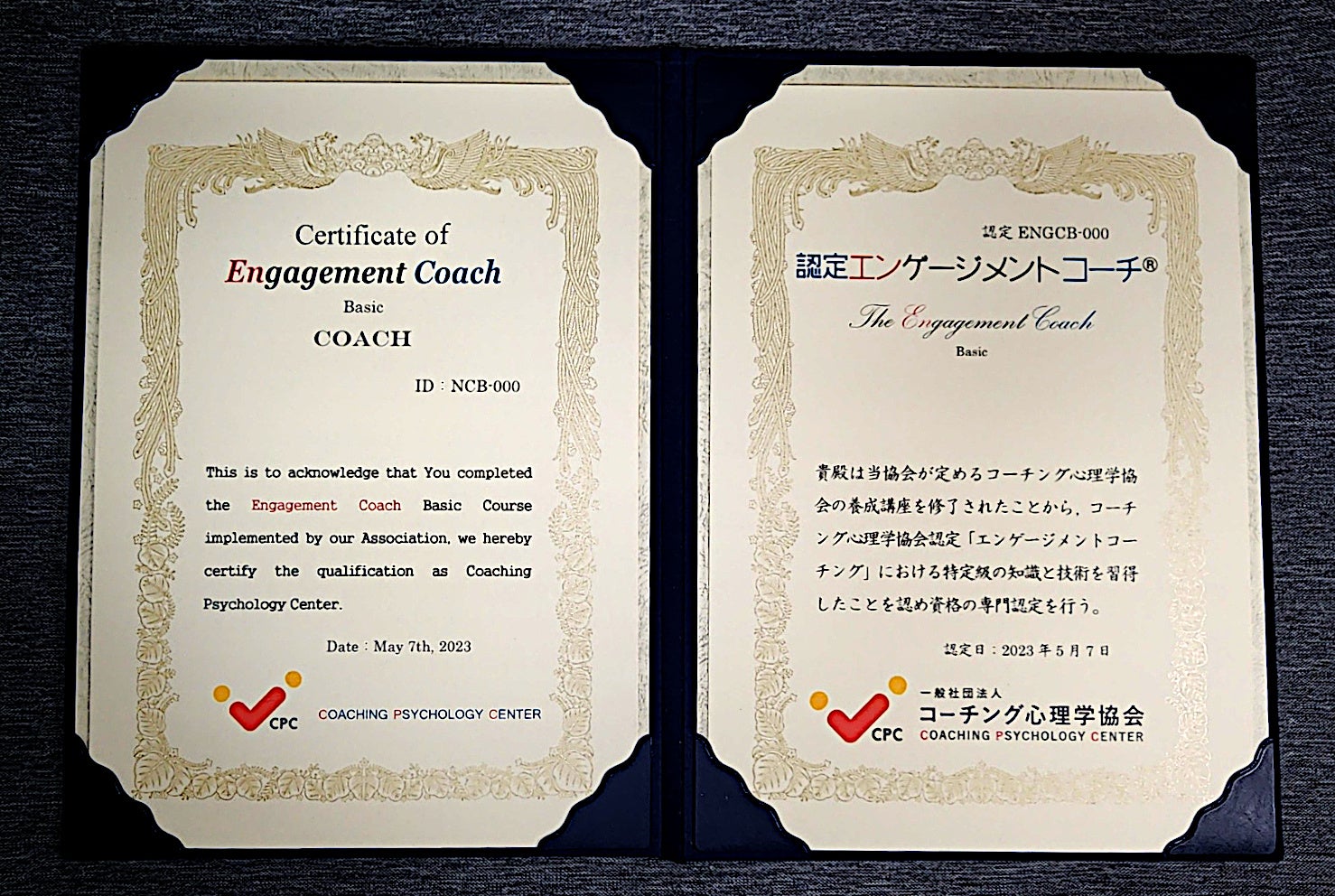 【認定エンゲージメント・コーチ®認定講座】当ワークショップを修了されると「認定エンゲージメントコーチ®」(Basic)の資格が取得できます。また、講座の資料の利用権、ダウンロード権などが得られ、すぐに実践できます。