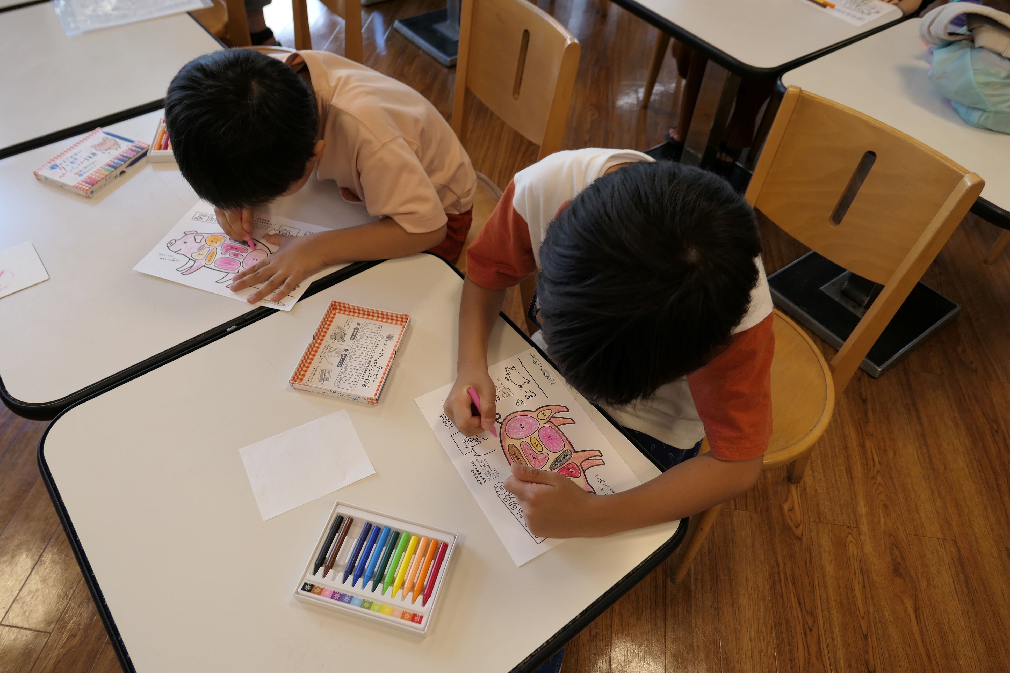 料理教室開催中、お子様は豚のぬり絵に挑戦。先程学んだ部位の知識を活かしながら、思い思いの色で塗り上げました。