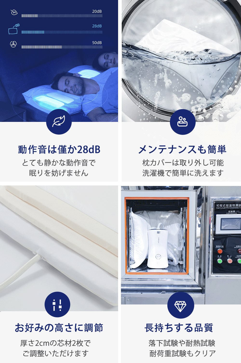 枕に内蔵されたセンサーが頭の位置を正確に認識します。センサーがいびきの音と振動を感知すると、エアーバッグが膨らみ、枕に傾斜をつけることで頭を傾けていびきを止めます。