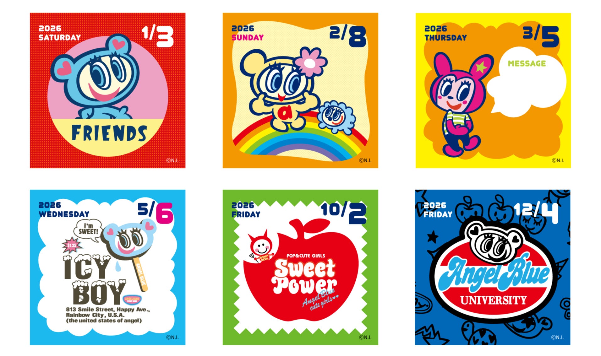 本商品の日めくりカレンダーは、90年代から2000年代初頭にかけて女子小学生の憧れを一身に集めたナルミヤ・インターナショナルのブランド「エンジェルブルー」とコラボ。人気キャラクターの「ナカムラくん」をはじめ、個性豊かな仲間たちが毎日異なるデザインで登場し、365日をカラフルに彩ります。