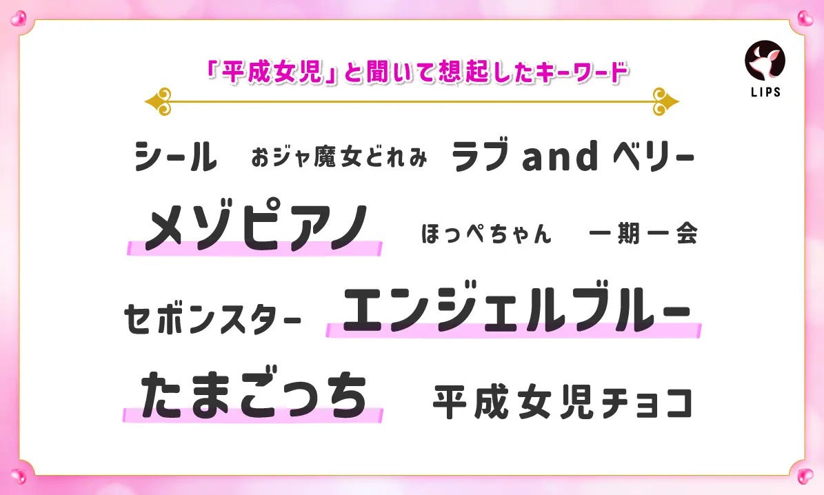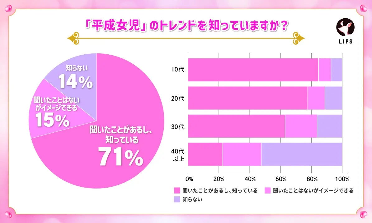 日本最大級のコスメ・美容サービスLIPS がユーザーを対象に実施した調査によると、LIPSユーザーの10〜50代の男女のうち約70%が「平成女児」トレンドを認知しているという結果が見られました。