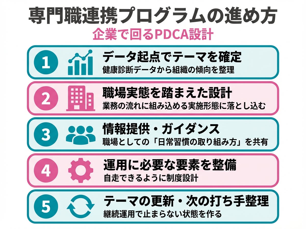 ・専門職連携プログラム:健康診断データを起点に、専門職が役割分担しながら、企業が実施しやすい施策設計と運用方法を整理する仕組みです。