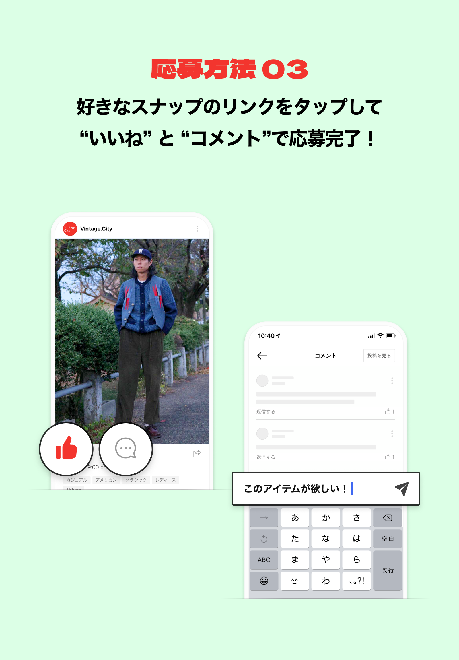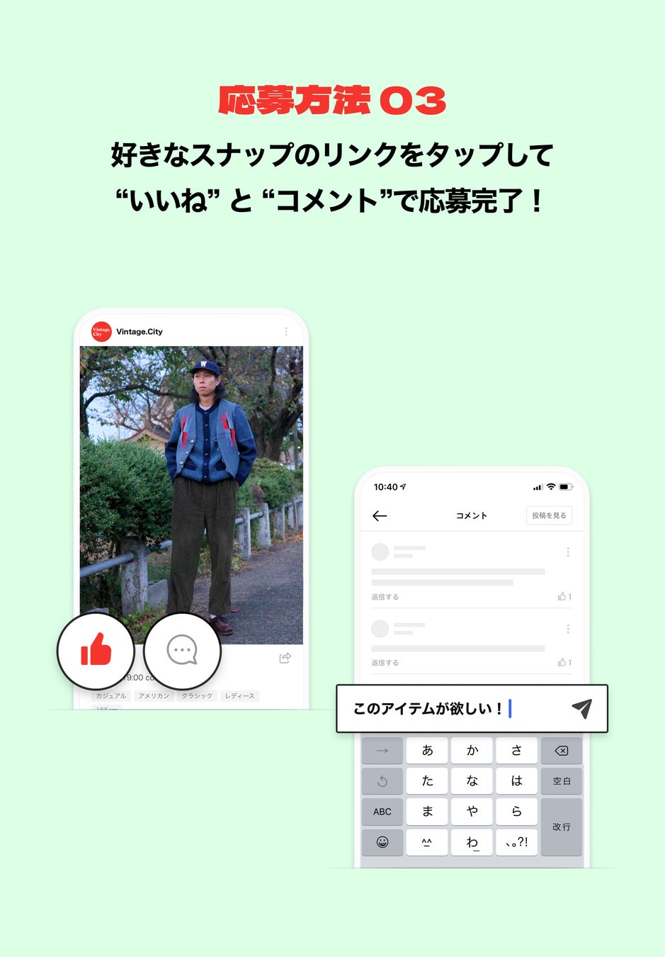ユーザーは、Vintage.Cityアプリの「スナップ機能」に投稿された、ファッションクリエイターご本人が着用したいくつかのスナップから好きなコーディネートを選んで応募することができます。