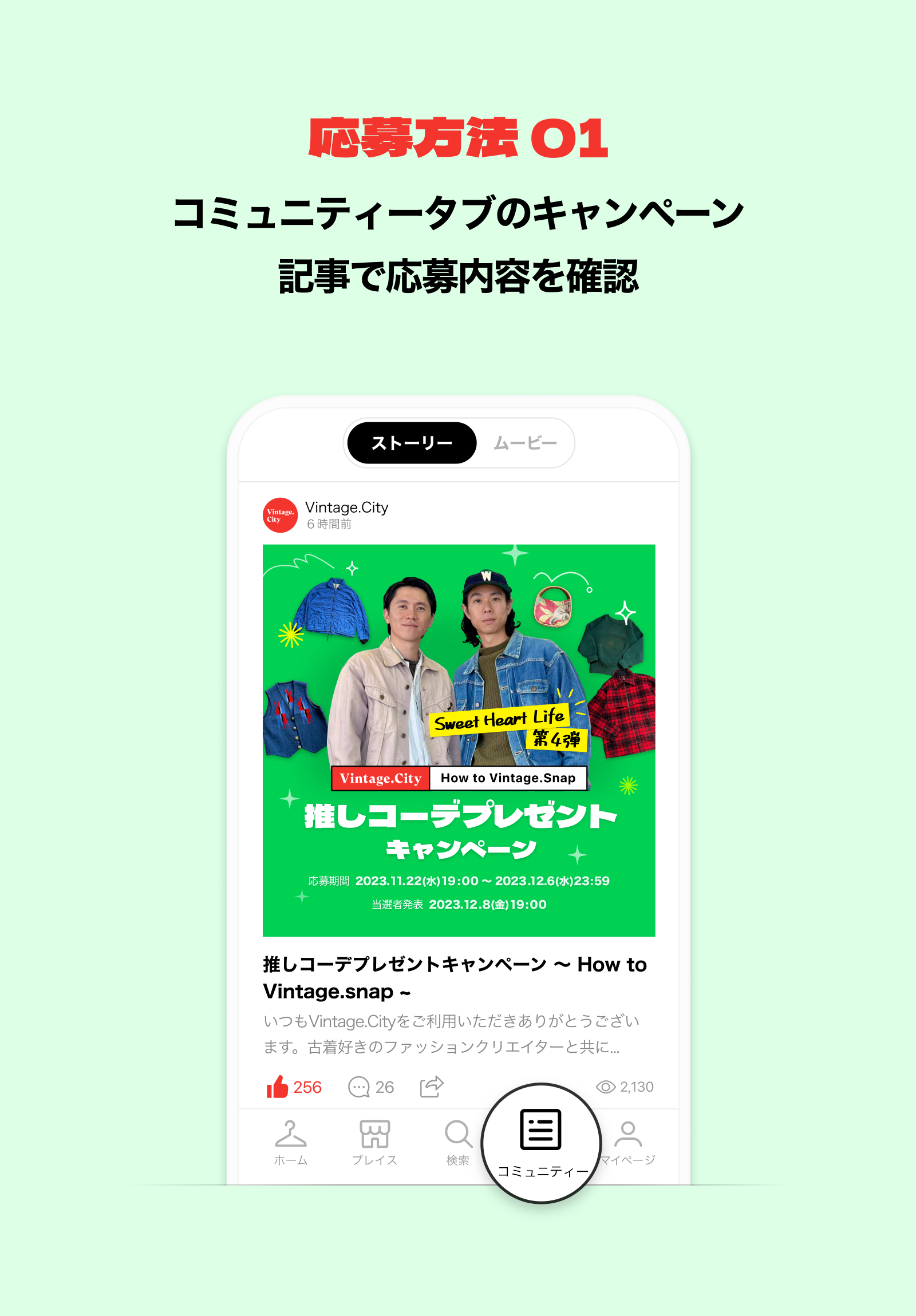 STEP1.ヴィンテージ・ファッション・アプリ「Vintage.City(ヴィンテージ・シティ)」内の「コミュニティ」ページに公開される「キャンペーン記事」で応募内容を確認。