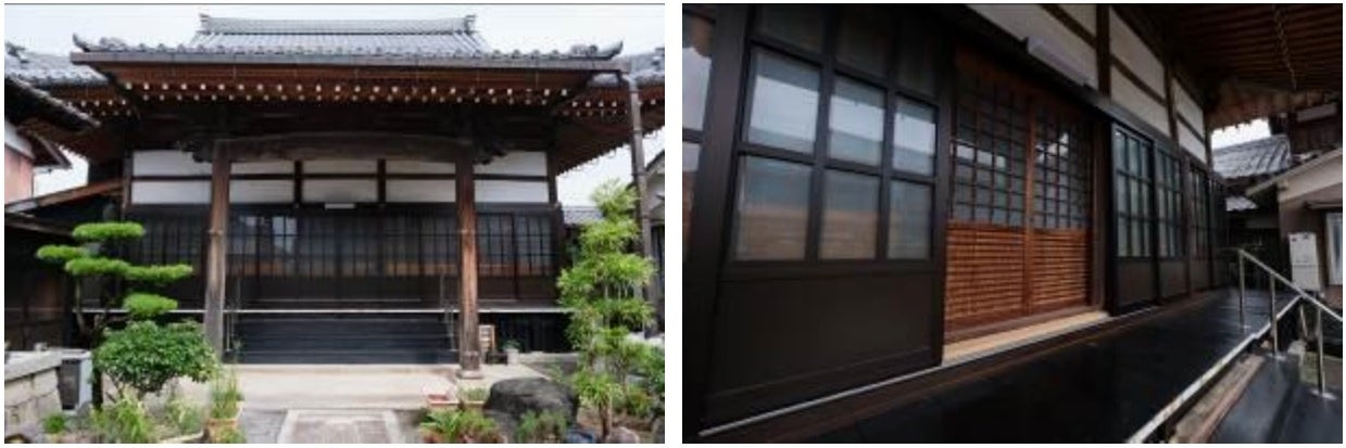 滋賀県は京都府よりも寺が多く、なかでも長浜市は滋賀県で一番多い市なのです。歴史的な寺の維持管理は大変で、古い本堂を保ちながら老朽化対策をするため、既存引違い扉の外にアルミの引き戸を付けています。中央では3本引きにして両側に引き分けているので、従来よりも開放的になりカラーアルミが古刹によく調和しています。