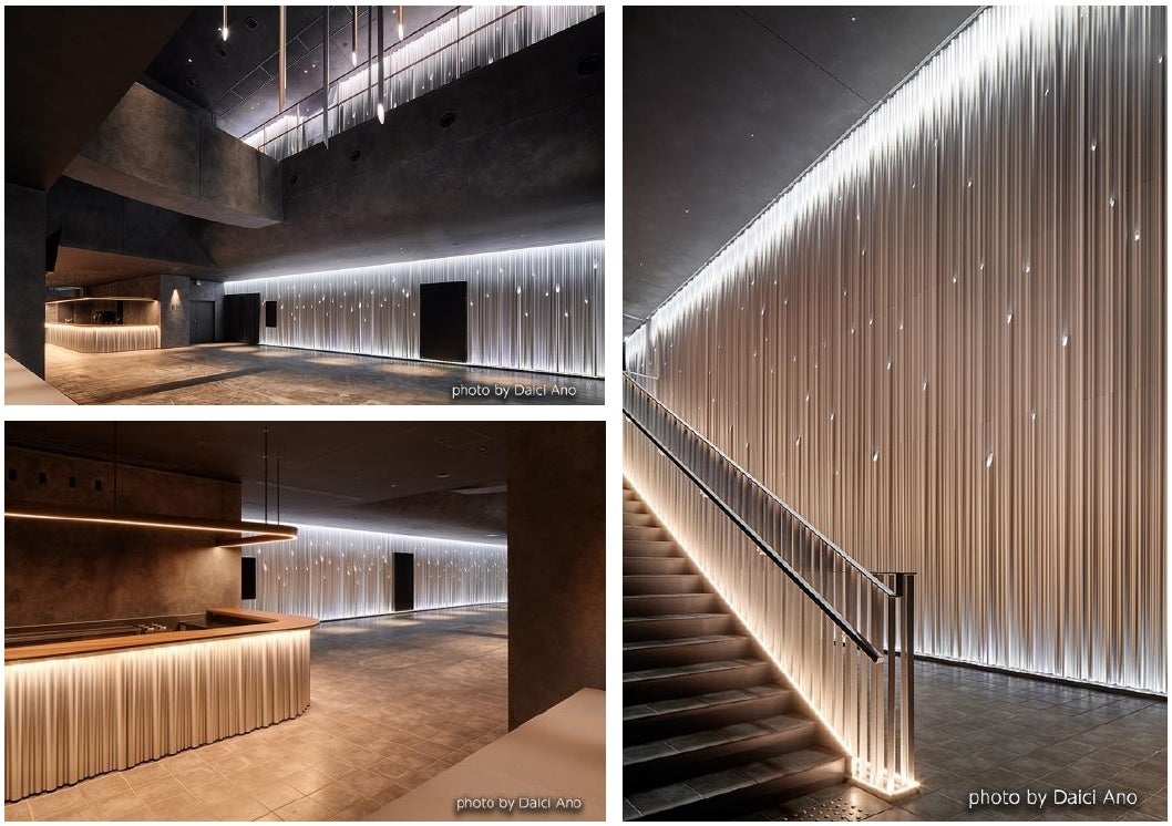 大中小の円弧を組み合わせた3タイプの特製汎用材を正反に使用して複雑な凹凸の壁面や腰壁を構成し、その前に、上端を斜めカットしたサイズの異なる3種の丸パイプをランダムに立て、カット面にLEDを仕込んでいるので、竹の切り口から光り輝く女の子が生まれたという民話を夢想しそうです。高いところで13m、緩やかな感じの壁面の上下端にLED光が仕込まれていて全体の色調を変えることができ、吹き抜け部分では、天井から3種の丸パイプが下がり、3次元のアートになっています。