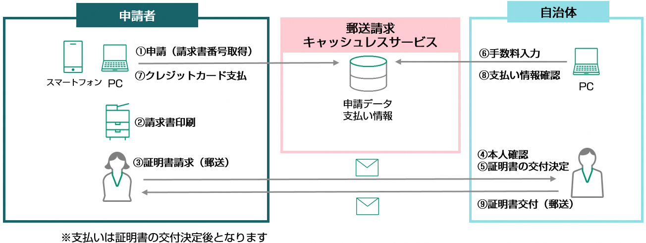 マイナンバーカードを持っていない住民が証明書を入手する場合や、法人・司法書士・行政書士が第三者の証明書を入手する場合、自治体窓口もしくは郵送で請求します。郵送で請求する(郵送請求)時には、手数料分の定額小為替※2を事前に購入した上で、必要書類とともに対象自治体へ郵送する必要があるため、請求者にとってコストや手間がかかります。また自治体においても、定額小為替の管理や、手数料の相違があった場合の電話対応などが発生しています。そこで当社は、手数料をキャッシュレスで決済し定額小為替が要らない郵送請求を実現する仕組みを構築。「郵送請求キャッシュレスサービス」として本年10月よりトライアル版の提供を開始しました。
