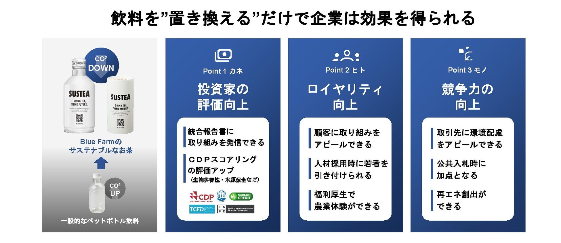 取組内容は、有機JAS認証茶葉を使用した「お茶のボトルド飲料」を製造し、企業が脱炭素や生態系保全の取組として購入するものです。