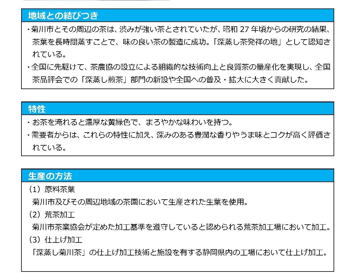 この飲料で使用する茶葉は、令和5年3月に「深蒸し菊川茶」でGI(地理的表示保護制度)に名称登録されたものです。