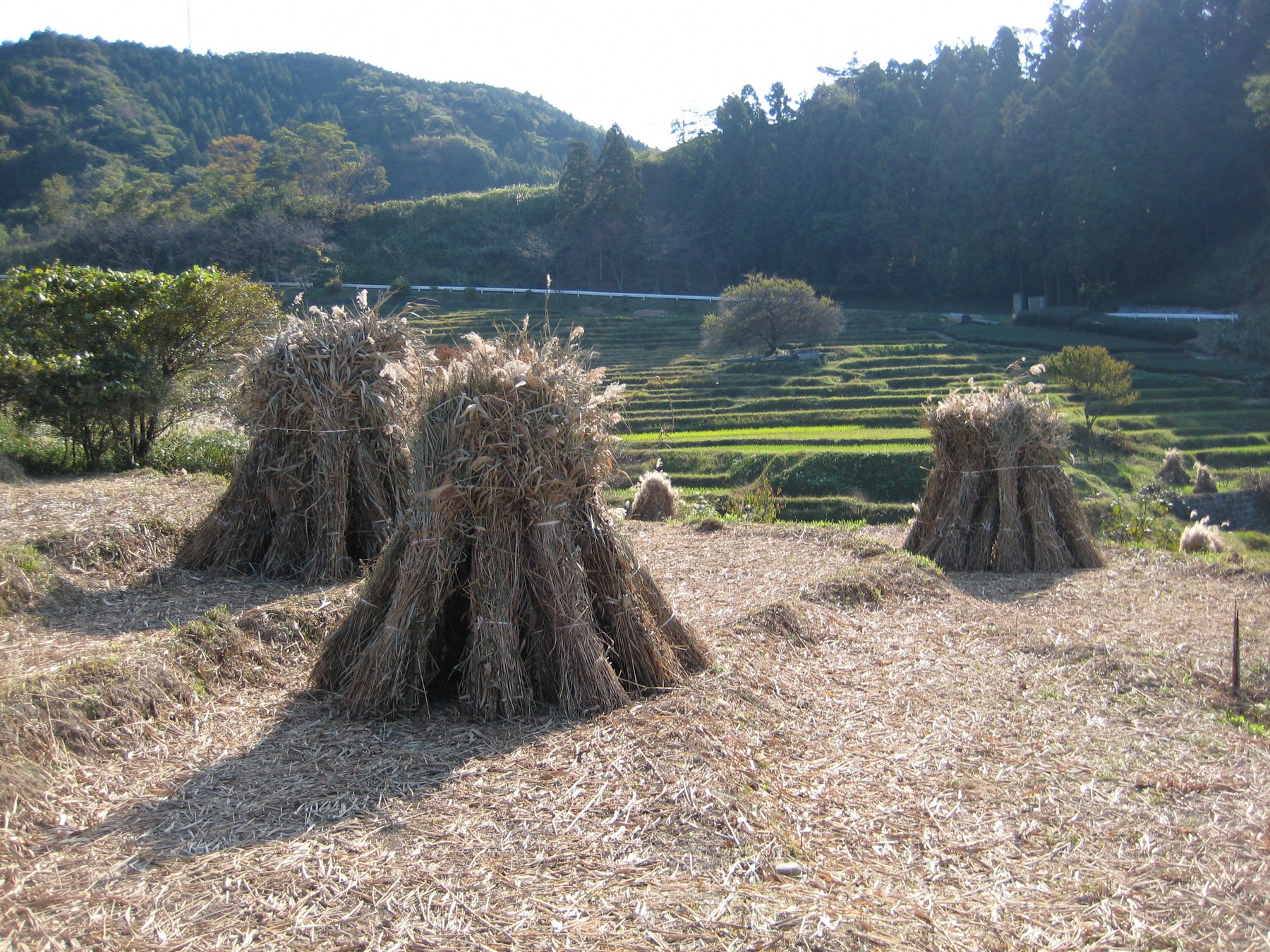 秋から冬に掛けて、茶園の周辺にある茶草場の草を刈り、束ねて乾燥させます。翌年の2月頃に乾燥させた草を細断し、茶園の畝間に敷き詰めます。夏にはただの草むらにしか見えない茶草場ですが、秋になるときれいに草は刈られ、刈られた草が束ねられて干してある風景を見ることができます。
