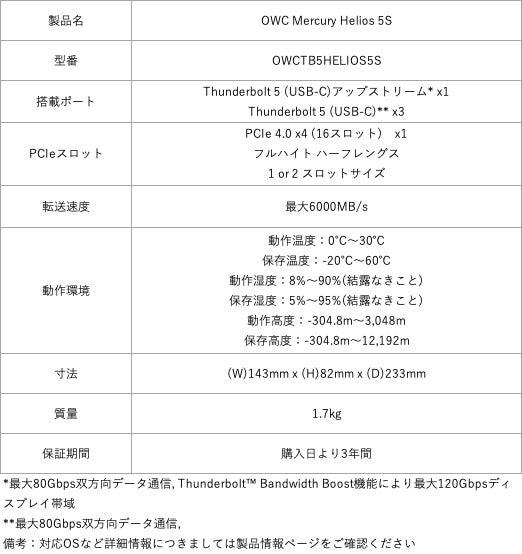 OWC Mercury Helios 5S は、PCIeスロットを搭載していないMacやPCに、外付けPCIeスロットと3つのThunderbolt 5ポートを追加し、限られたスペースのマシンをフルサイズのワークステーション級システムへと進化させます。 超高速PCIeストレージ、8Kビデオキャプチャカード、オーディオDSPカード、高速ネットワークカードなどを、1本のThunderboltまたはUSB4ケーブルで簡単に接続可能。追加のツールは一切不要。 最大6000MB/sの帯域幅を備え、PCIe 4.0 x4カードをフルスピードで動作させながら、データ転送量の多い外付けThunderboltドライブも同時に活用できます。内蔵PCIeスロット並みのパフォーマンスに、外付けスロットとハブの柔軟性を兼ね備えたMercury Helios 5Sは、クリエイティブプロフェッショナル、ポストプロダクション、VFXチーム、IT担当者、開発者など、時間とコストを節約しながら拡張性を求めるあらゆるプロフェッショナルに最適なソリューションです。