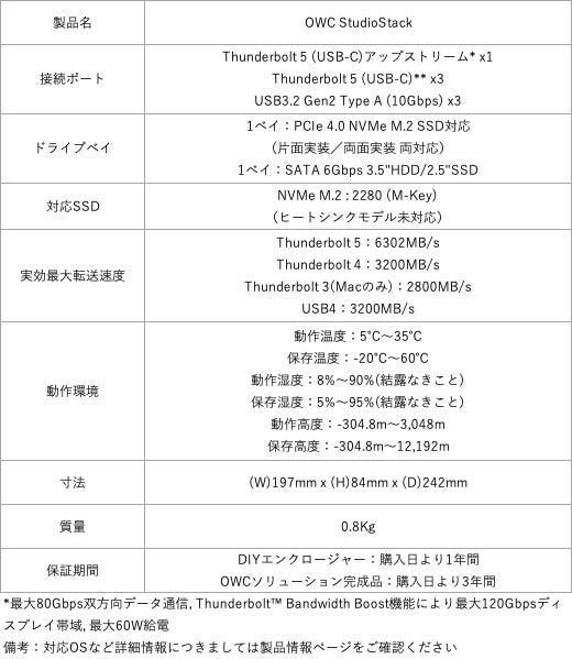 OWC StudioStack は、Mac Studioおよび2018〜2023年のMac miniに対応した、世界初・最速・最大容量のThunderbolt 5対応スタッカブル・ハイブリッドストレージソリューションです。 最大8TB NVMe SSDと最大24TB HDDが搭載可能で、512GBのMac Studioと比べて最大64倍の容量拡張を可能にし、最新のMac Studioに匹敵する最大6302MB/sの転送速度を実現。さらに、Thunderbolt/USB-Aポートを合計6基備え柔軟な拡張性を提供します。 StudioStackは、写真・映像・CGI・オーディオ制作といったクリエイティブワークの効率を最大化するだけでなく、AIエンジニアやデータサイエンティストが大規模LLMを実行・保存する環境としても理想的です。 一般ユーザーにとっても、Mac Studioの性能とデザインに調和しながらストレージ容量を簡単に拡張できる頼れるパートナーです。Mac Studioに複数のThunderboltディスプレイを追加して、さらに内蔵ストレージを拡張したい方にも最適です。