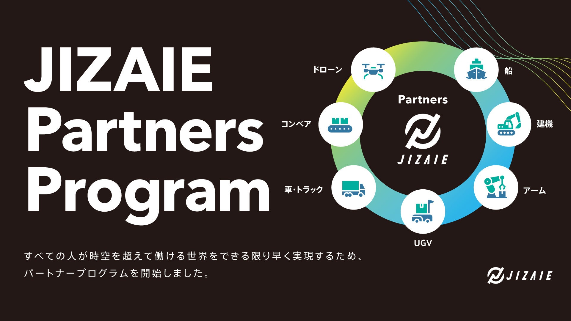 JIZAIE Partners Programは、遠隔操作・映像伝送・AI制御などの中核技術を用い、業界横断での社会実装を共に推進する共創型の連携枠組みです。パートナー各社との協働により、技術開発から実証、社会展開に至るまでを包括的に支援しています。