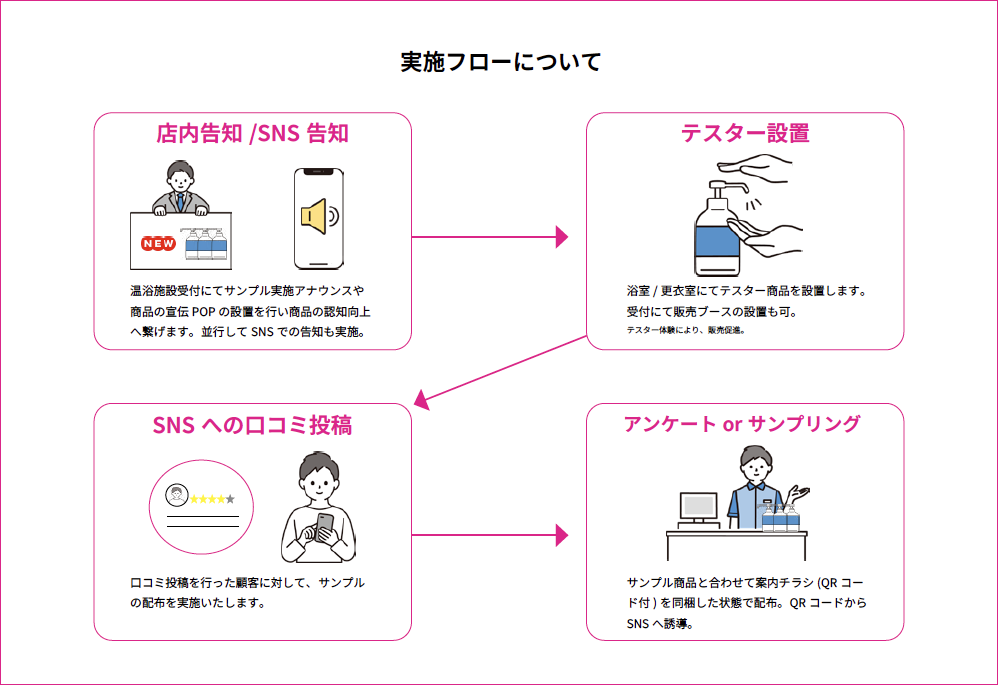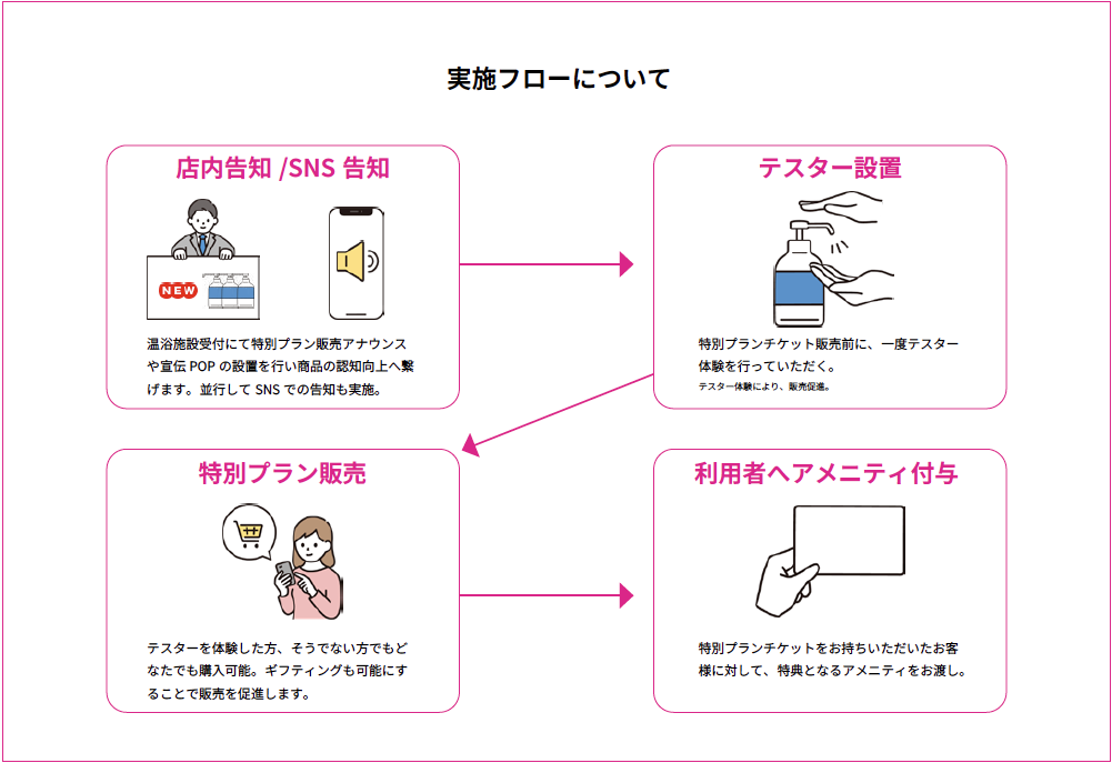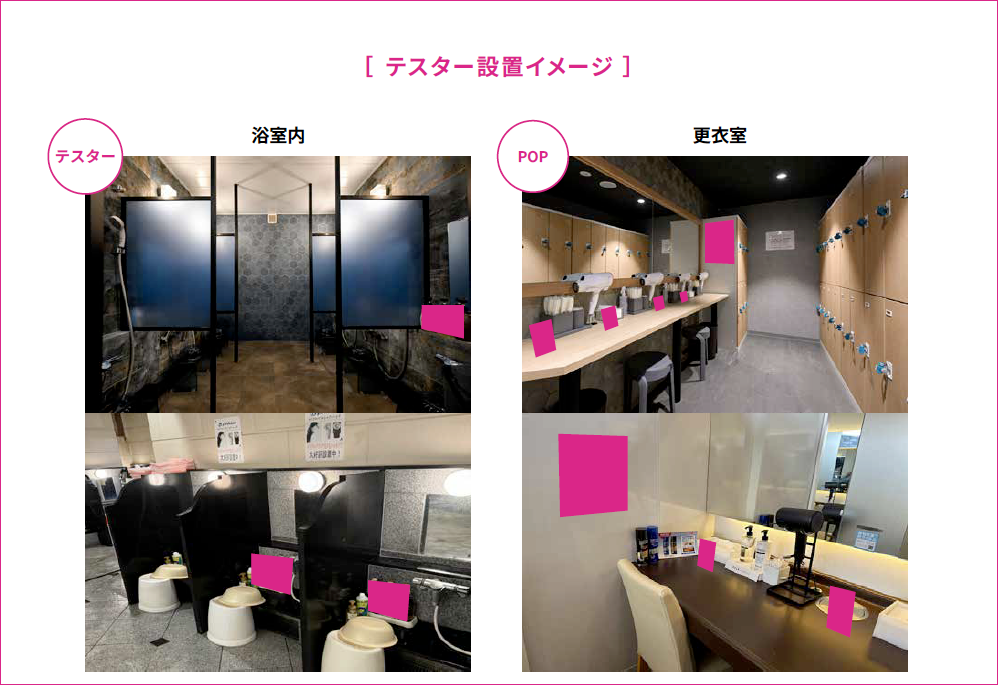 温浴施設を利用されるお客様に対して商品をリアルに体験いただき、認知拡大、販売促進へと繋げていくことができます。