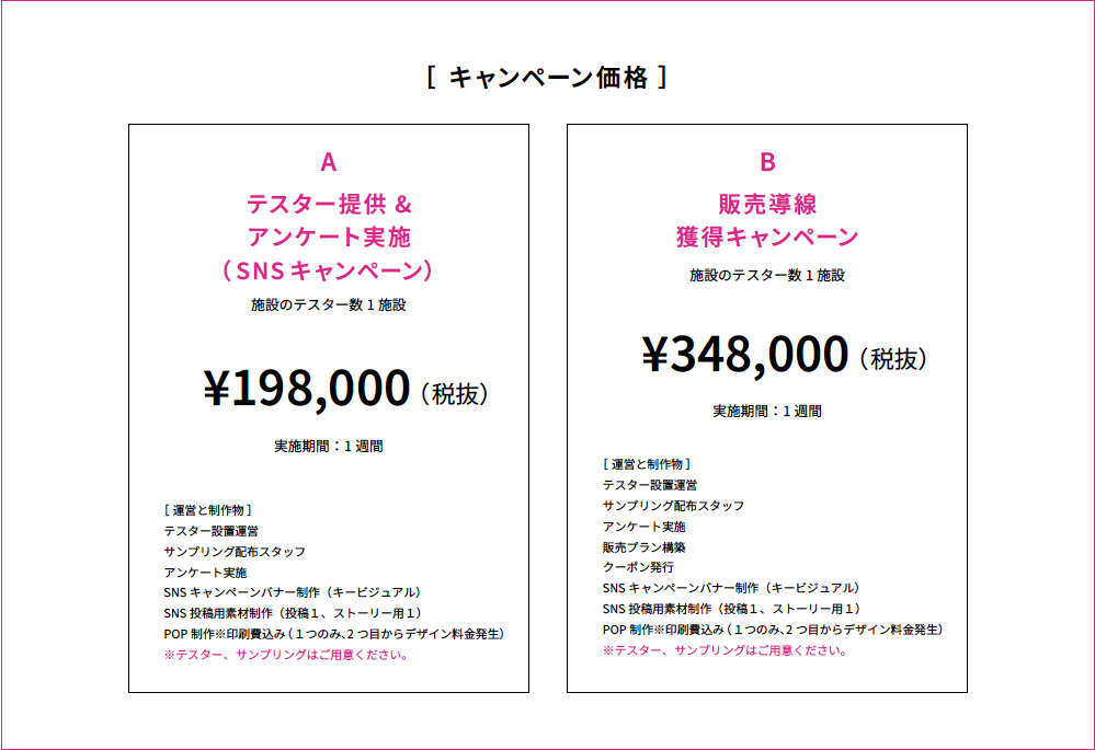テスター設置により、商品を実際に体験いただいた上でサンプリング配布の実施やSNSでの口コミ投稿やアンケート実施を行います。
