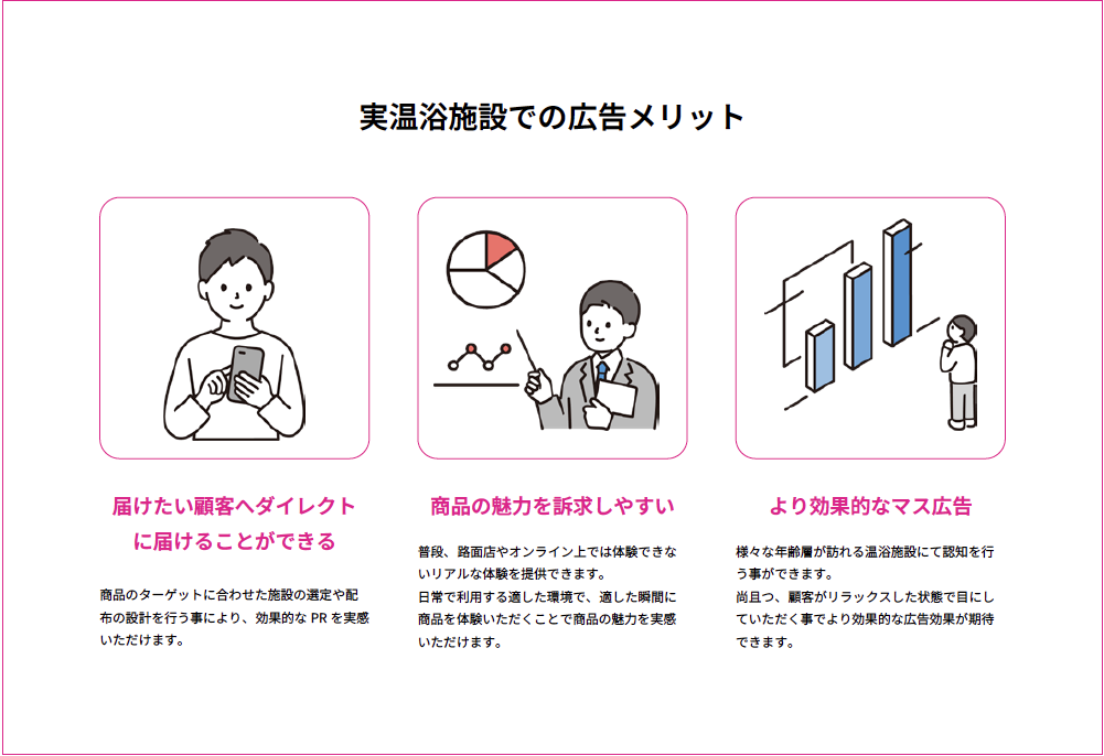 温浴施設を主に媒体とした、その媒体を利用してお客様とリアルな体験や広告を行うサービスです。