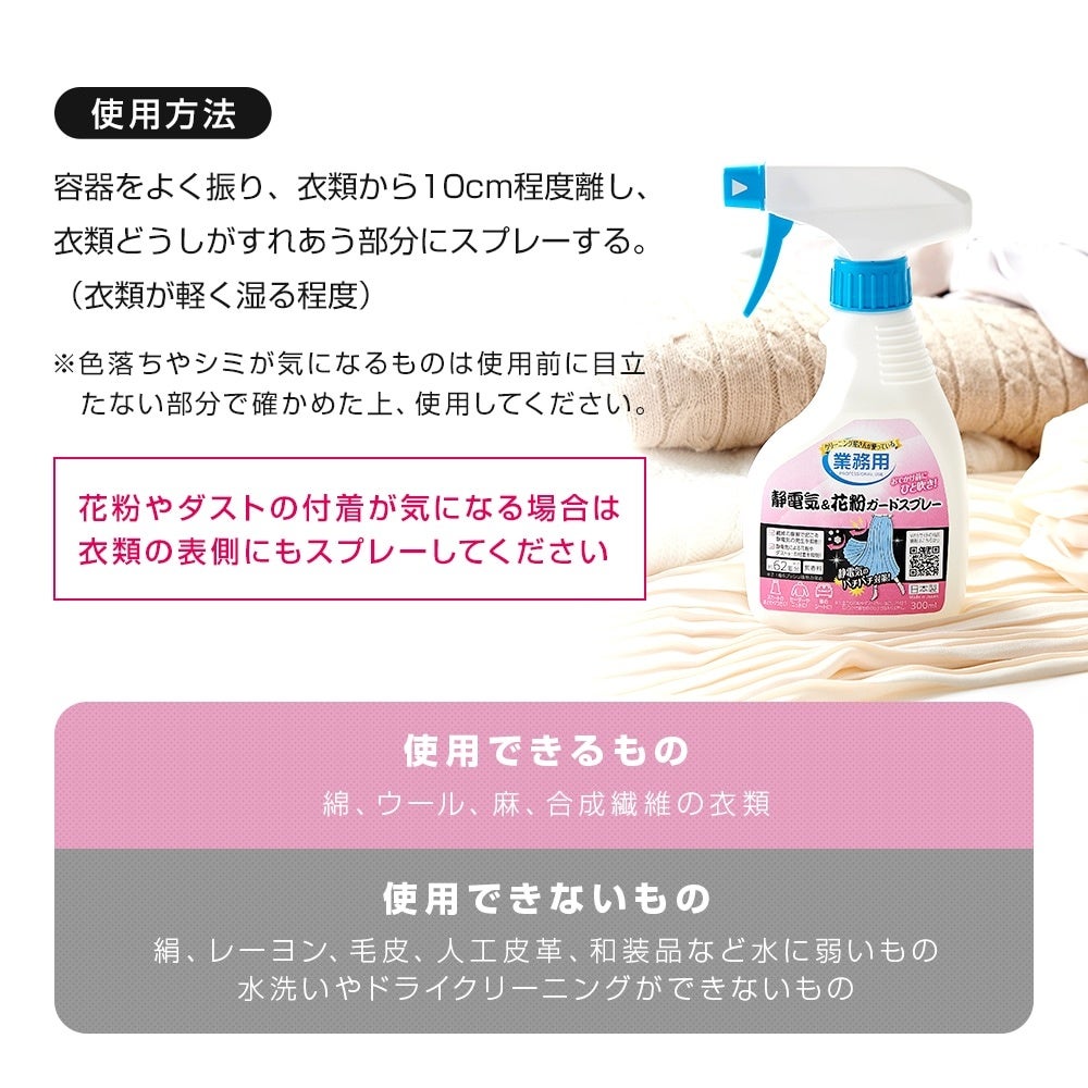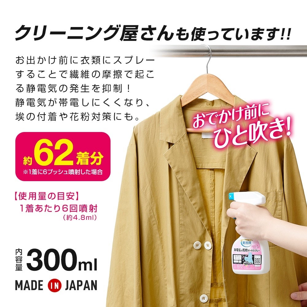 お出かけ前にひと吹き!静電気&花粉をガード。クリーニング屋さんが使っている業務用。繊維の摩擦で起こる静電気の発生を抑制し、花粉やダスト(※1)の付着を抑制!スカートのまとわりつきに!セーターやニットに!車のシートに!約62着分(※2)。無香料。 ※1:全ての花粉やダスト(ちり、ほこり、PM2.5など)の付着を防ぐわけではありません。 ※2:1着6プッシュ噴射の場合