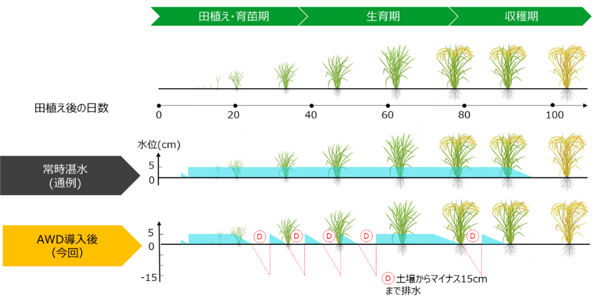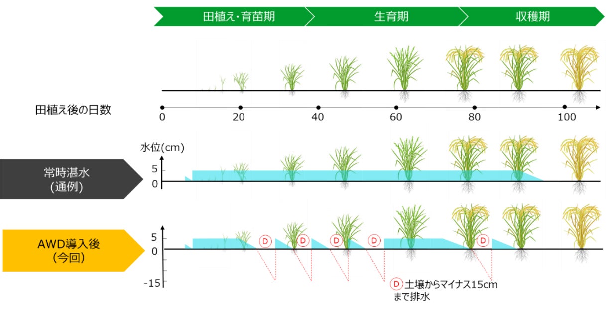AWDは、水稲の栽培期間中、水を抜いて水田の地表面を十分乾燥させた後、再度湛水(たんすい)するという潅水(かんすい)制御を複数回にわたって繰り返す水管理手法です。水田土壌内にはメタン生成菌が存在し、嫌気条件下では稲わらなどの有機物を餌に温室効果ガスであるメタンを発生させますが、断続的に水田から水を抜くことで常時湛水時より土壌中により多くの酸素を供給すると、メタン生成菌の活動が抑制され、メタン排出量が低減します。