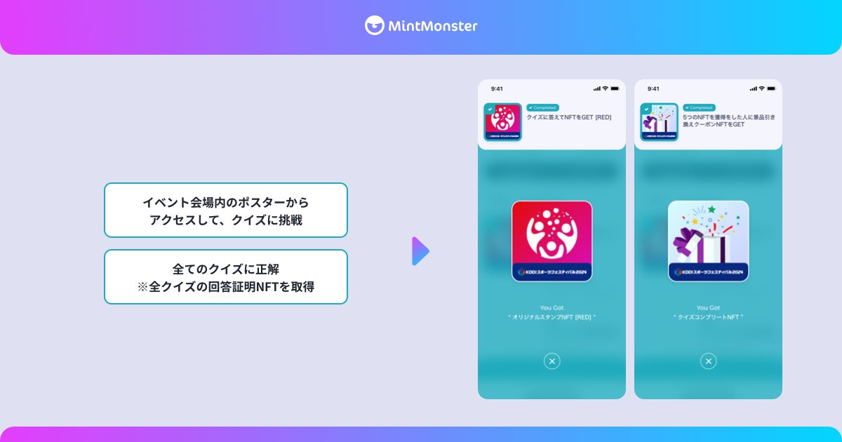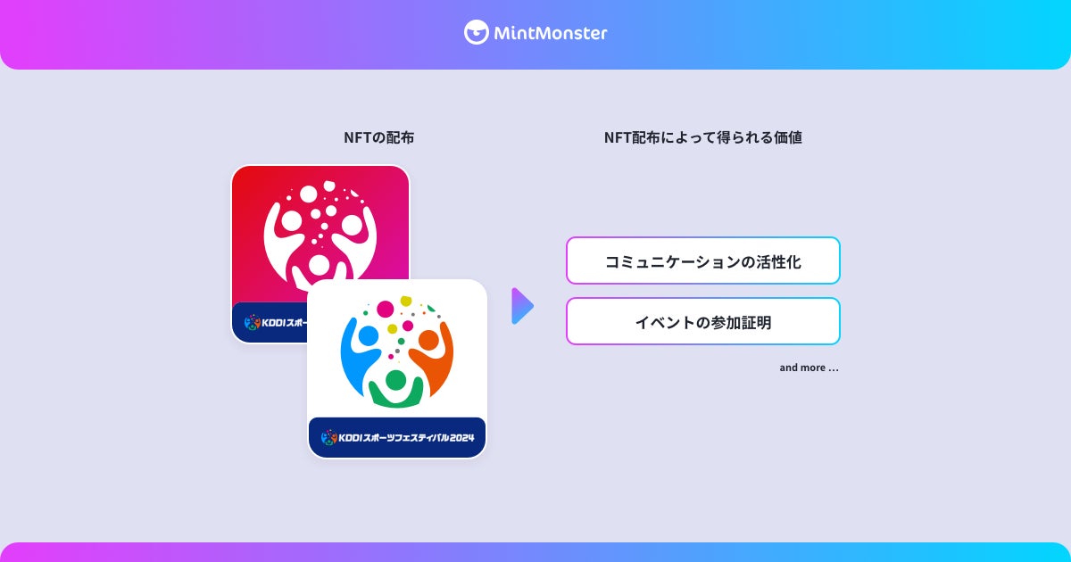 法人向けにWeb3ソリューションを展開する株式会社クリプトリエ(所在地:東京都中央区、以下 クリプトリエ)は、KDDI株式会社(所在地:東京都千代田区、以下 KDDI)の社内運動会「KDDIスポーツフェスティバル」にNFTのビジネス活用プラットフォーム「MintMonster(ミントモンスター)」を提供したことをお知らせいたします。また、「MintMonster」はKDDIが提供する暗号資産ウォレット「αU wallet」への対応を開始いたしました。