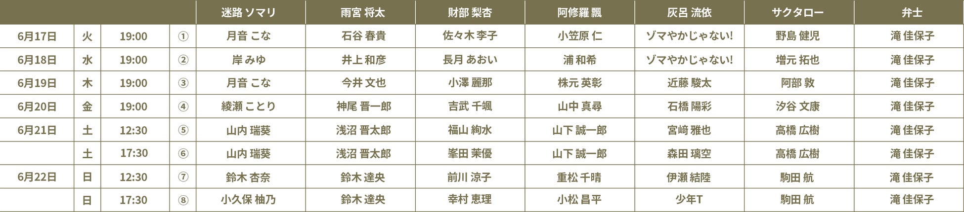 6/17(火)~22(日)8公演@池袋・あうるすぽっと。初日公演は月音こな、石谷春貴、佐々木李子、小笠原仁、ゾマやかじゃない!、野島健児、滝佳保子が出演。