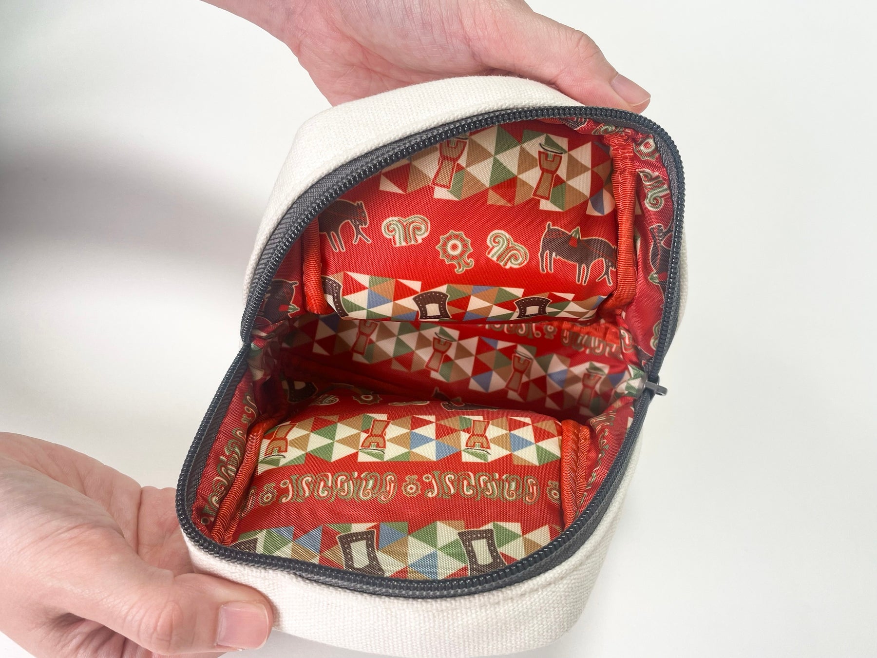 こだわりは? と聞かれれば、「全部です」と答えたくなるほど、試行錯誤したポーチです。日本を代表する装飾古墳の魅力を余すことなく伝えるために、外側の刺繍も、極彩色の内生地のカラーリングも、関係者に話を伺い資料を読み込み、幾度も試作品を作って最終形に辿り着きました。