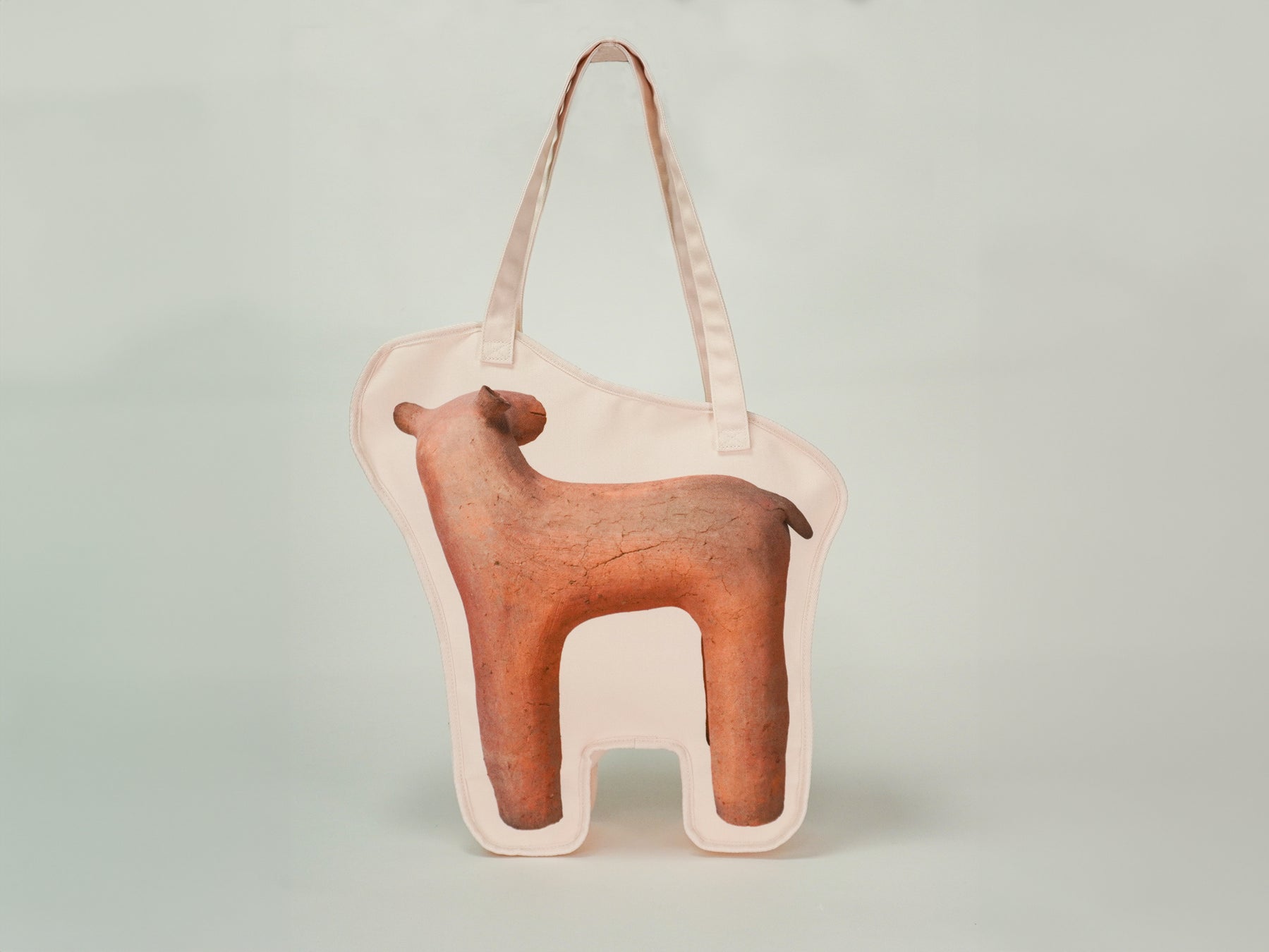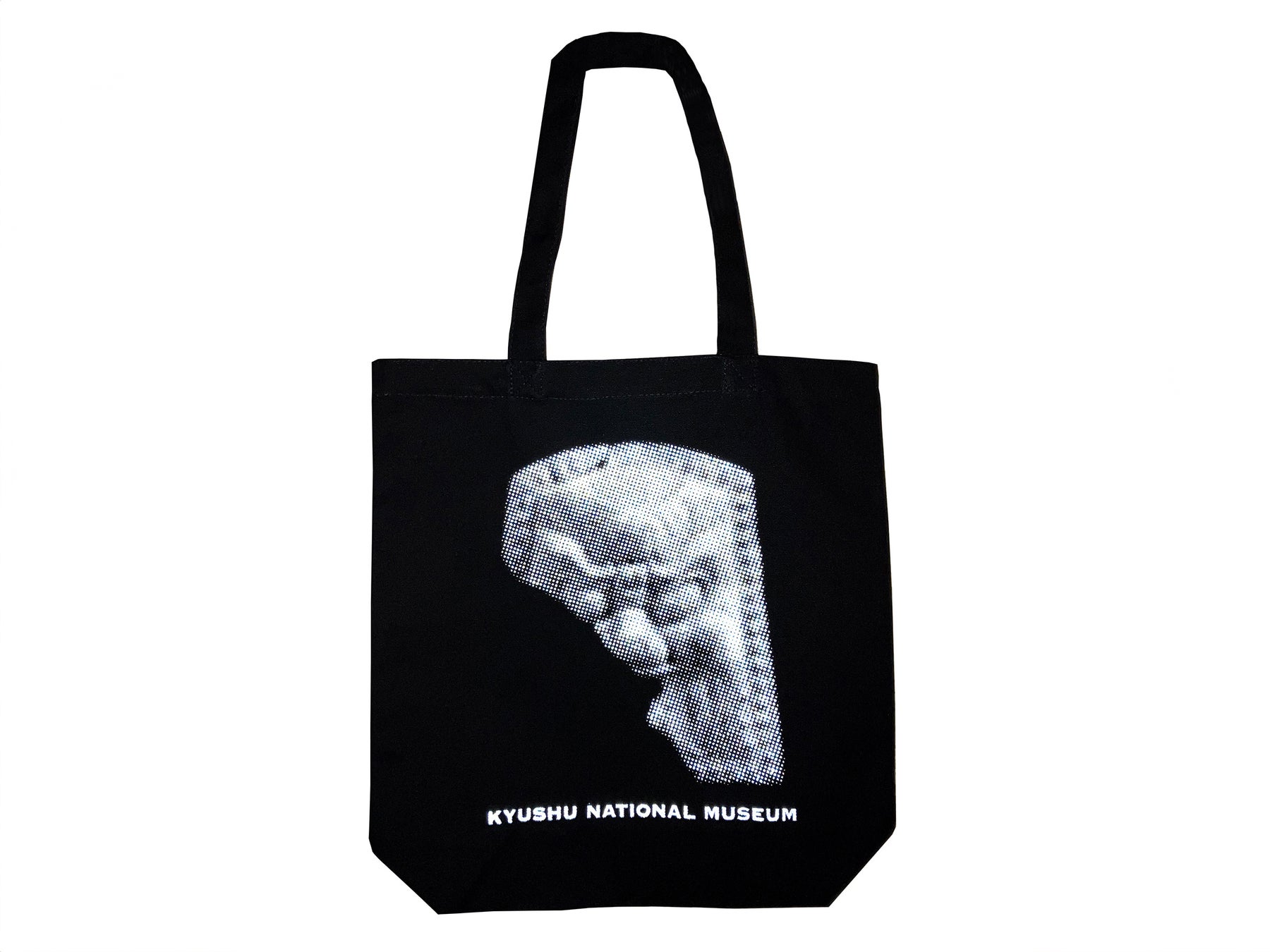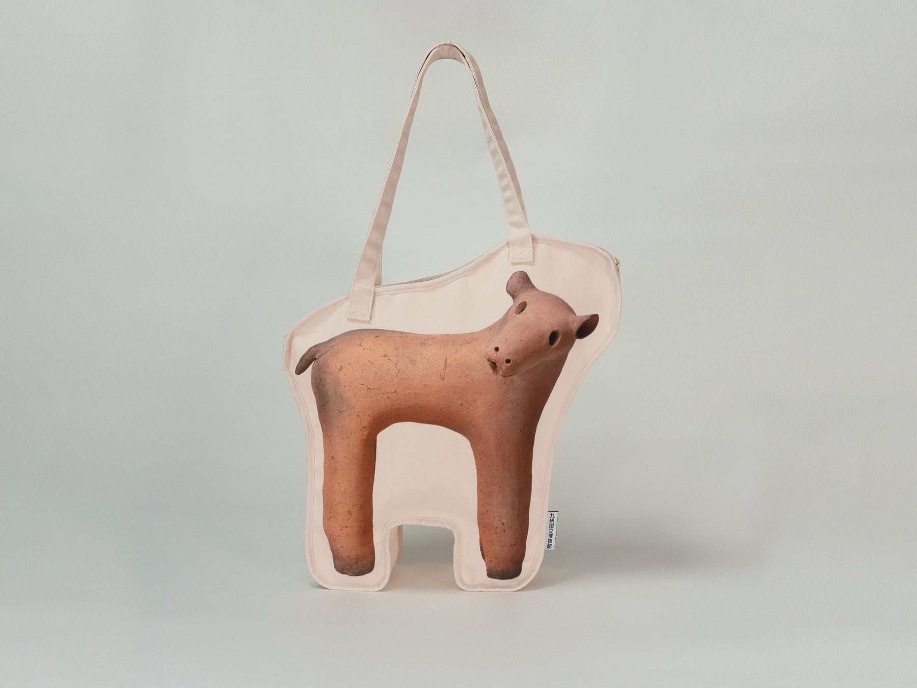 九州国立博物館の収蔵品の中でも高い人気を誇る「埴輪鹿」。周りを警戒して振り返る姿だそうですが、まるで後ろから呼びかけられて「何?」と振り向いたかのようなポーズにも見えて、愛着が湧きます。背面を裏側に印刷することで、どちら側から見ても埴輪のトートバッグであることをアピールできます。