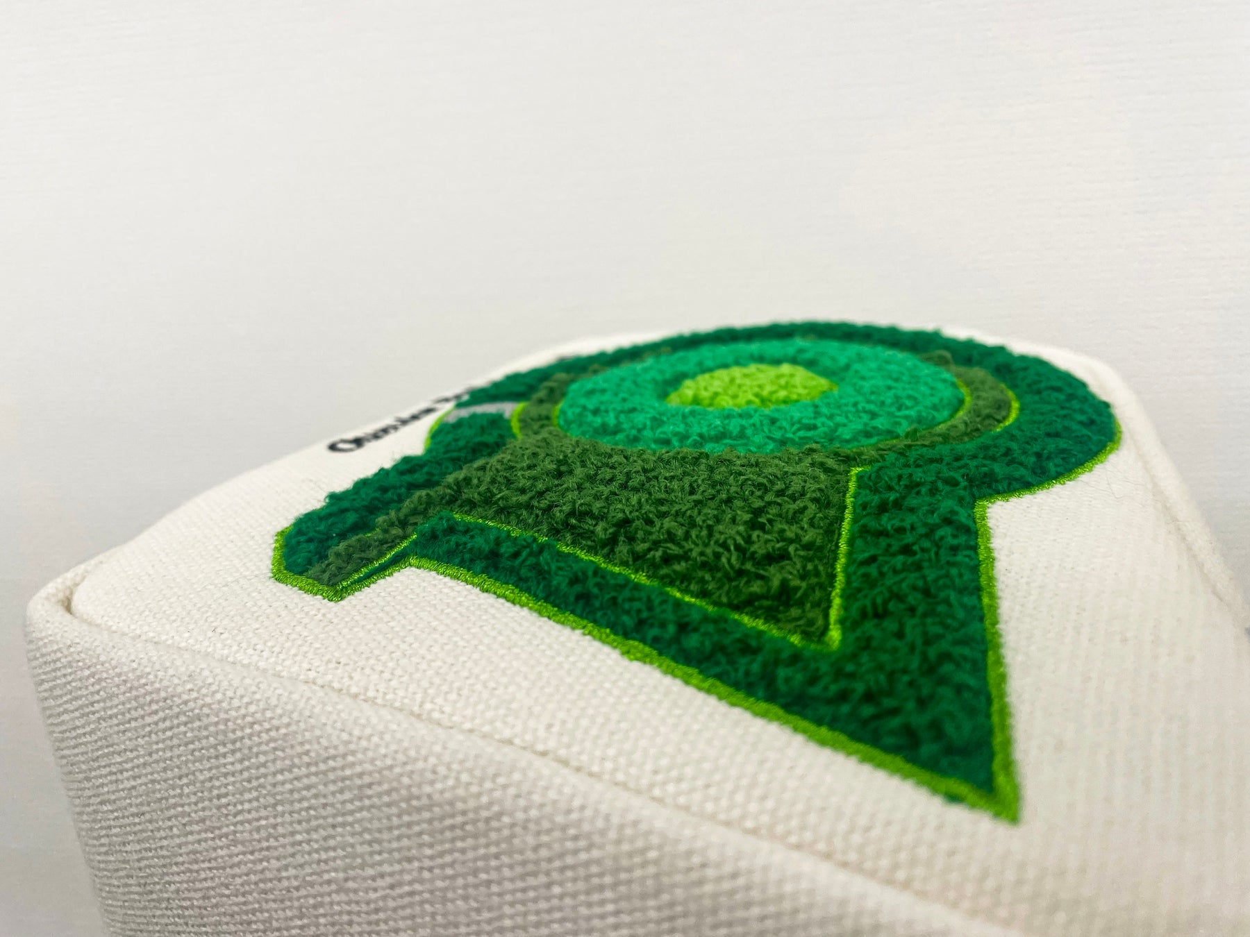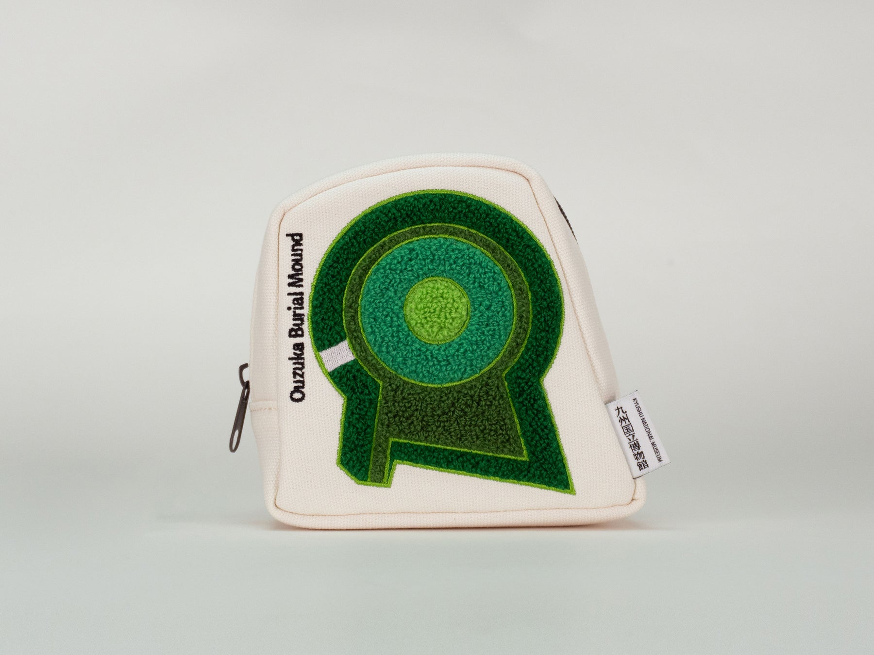 ポーチの外形は、墳丘の現存部分を元にダイカットにしたので、ちょっと歪(いびつ)。この歪さもポイントのひとつです。墳丘に草が生い茂る様子は相良刺繍のモコモコ感で再現しました。